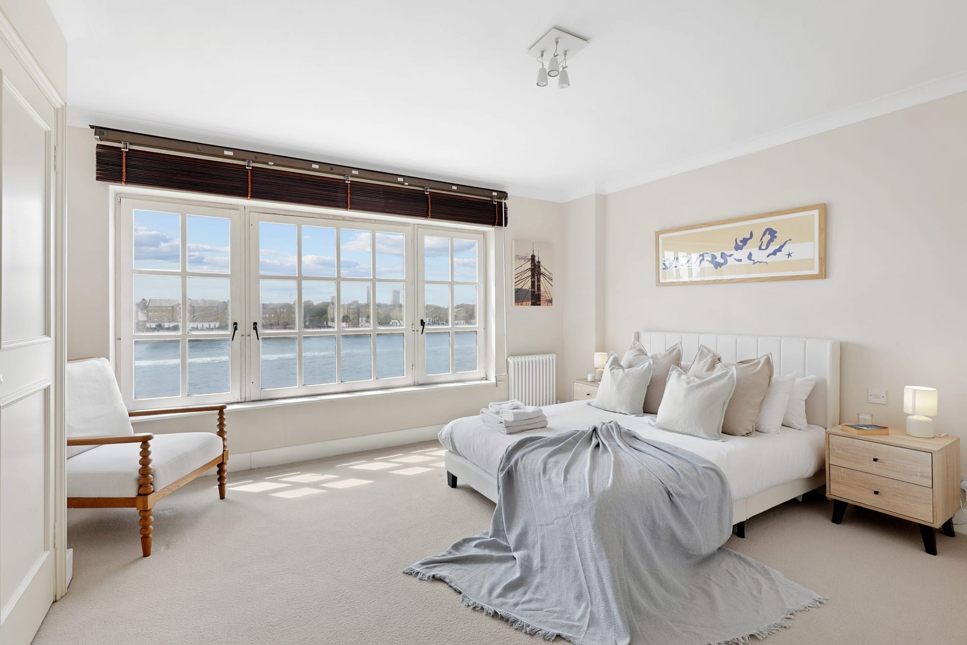 Limehouse Blyth’s Wharf is a beautifully designed four-bedroom townhouse that offers a luxurious riverside retreat in the heart of Limehouse, just moments from Canary Wharf. Set across multiple floors, the home is perfectly suited for families, friends, or business travellers seeking a spacious and serene place to stay in London. The property boasts a large open-plan kitchen and dining area, ideal for hosting meals or enjoying quiet evenings in. The living area leads to a private balcony with sweeping views over the River Thames, while an outdoor patio at the rear provides a peaceful spot to relax with a coffee or glass of wine. Three modern bathrooms, including two en-suites, offer added privacy and convenience for larger groups.