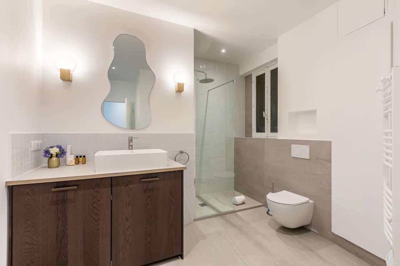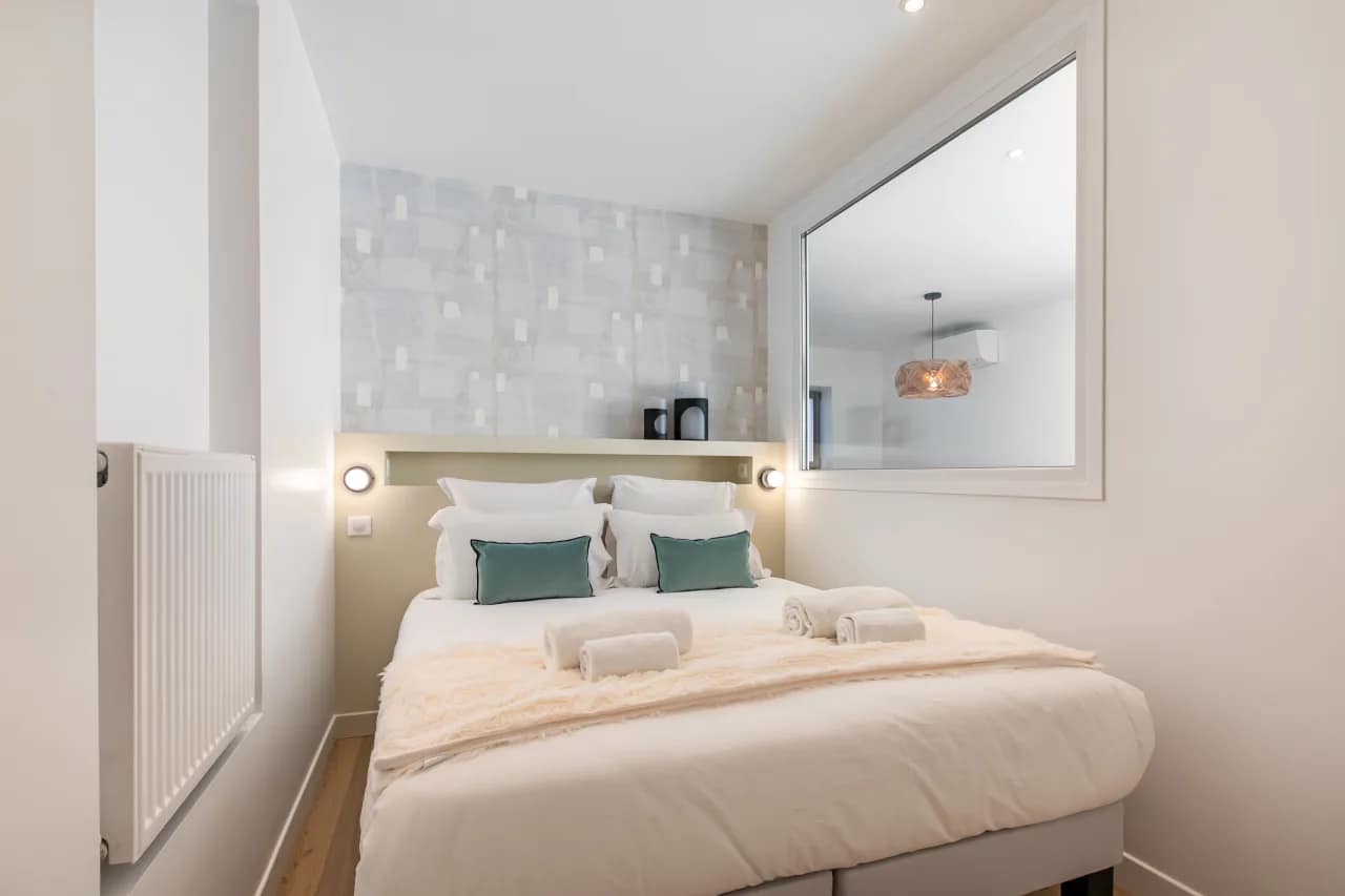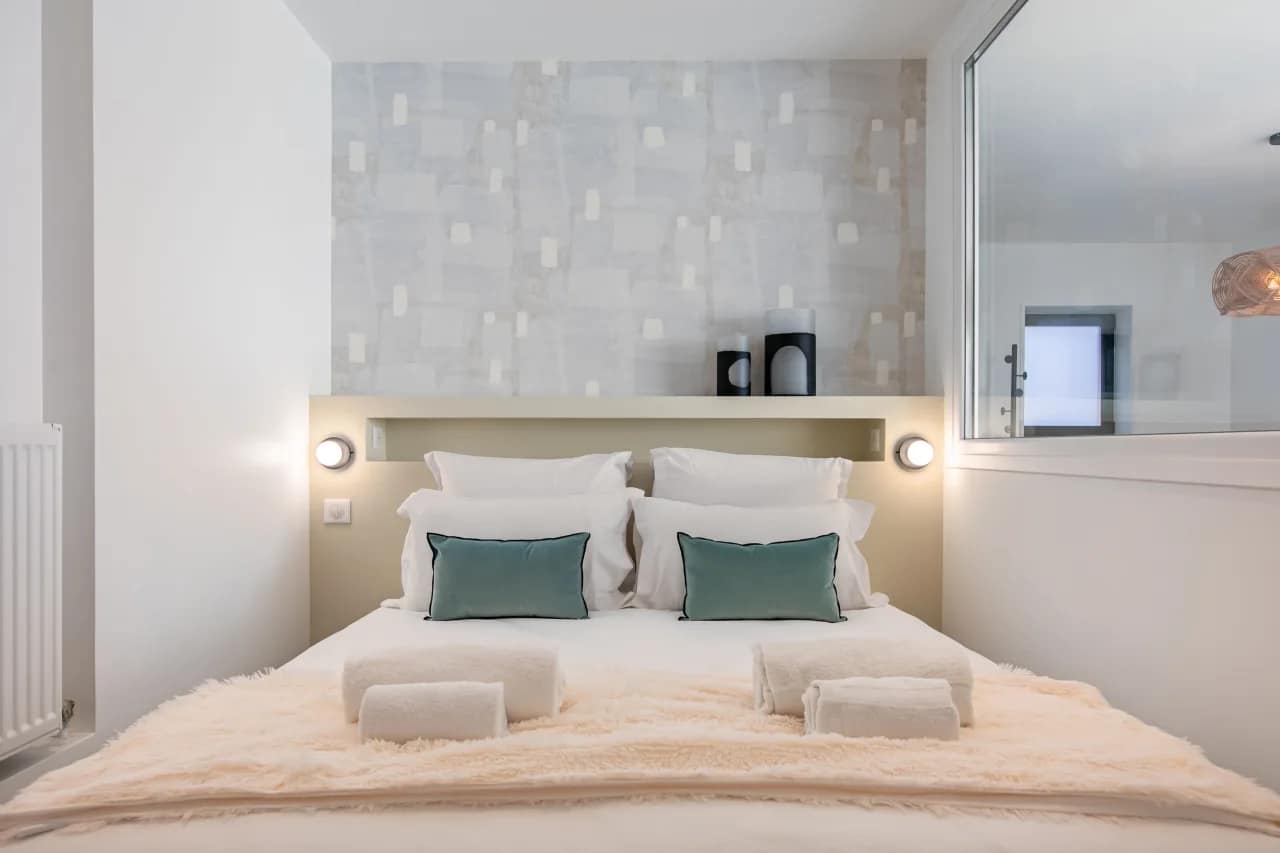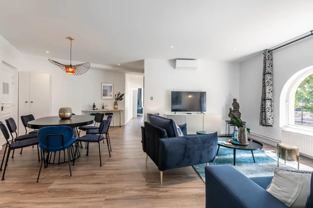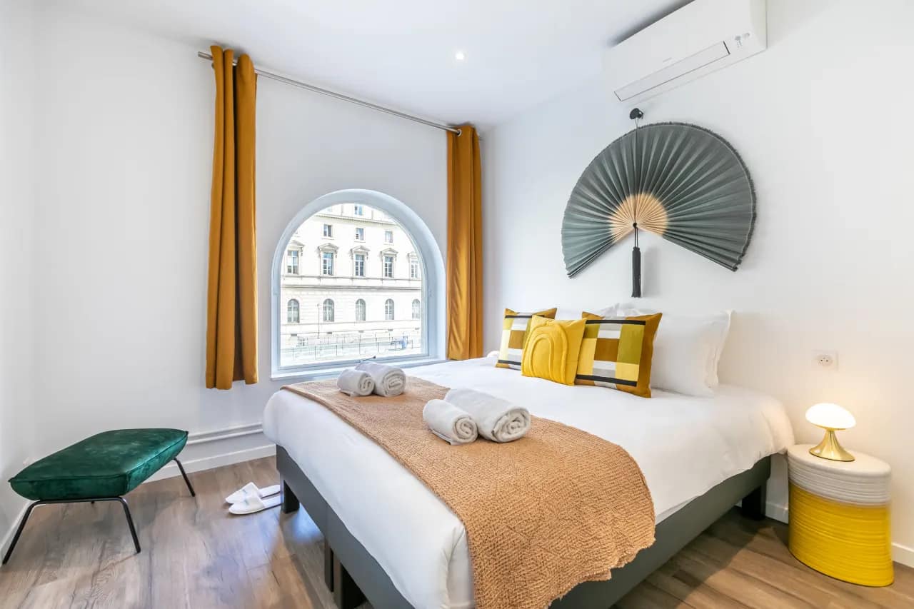 The Louvre Museum Apartments welcome you with Parisian elegance and charm, perfectly designed for comfort and style. With its spacious 75m² layout, it can accommodate up to four guests, making it ideal for couples, solo travellers, or even small families. The interior, crafted by our local designer, combines soothing earth tones with natural light to create a calm, urban oasis in the bustling heart of Paris. Gleaming wooden floors add warmth, while large arched windows flood the apartment with daylight and frame picturesque views of the city. Mirrored accents bring a touch of whimsy, and the fully equipped kitchen allows for cosy meals enjoyed at home. The plush bedroom and inviting living area provide the perfect spaces to relax after a day of exploring.