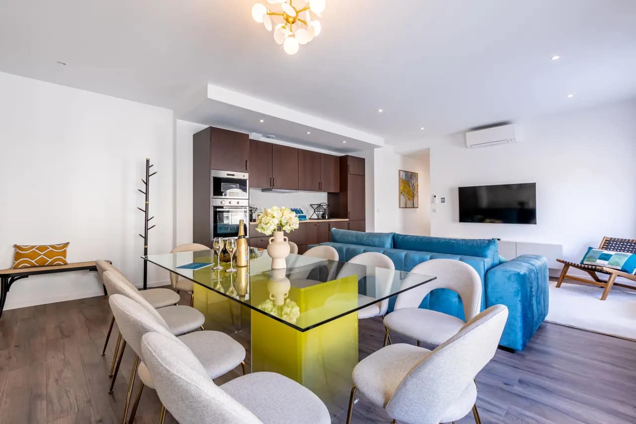 Premium amenities include free WiFi, cable TV, hotel-quality beds and linens, luxury toiletries, and a Nespresso machine to start your mornings right. The apartment combines modern convenience with Parisian elegance, featuring a fully equipped kitchen with stove, oven, microwave, and Nespresso machine, a spacious dining area, comfortable beds with luxury linens, a sleek bathroom with rain shower and high-end toiletries, in-unit washer and dryer, smart digital locks, city-view windows, and thoughtful touches such as baby cots, high chairs, slippers, and ample storage, ensuring a seamless and indulgent stay in the heart of Paris.