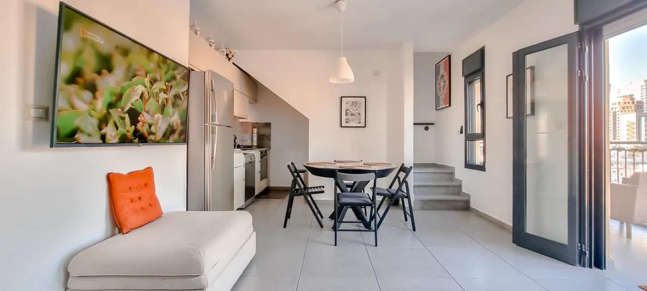 The Markolet Street Apartments are a stylish 85m² duplex penthouse in the heart of Tel Aviv, comfortably accommodating 4 guests. This two-bedroom, two-bathroom apartment features a large living room and a spacious terrace, offering breathtaking views of the city from every room. Designed with minimalist urban decor, the apartment provides a clean and restful atmosphere, combining style and comfort for a relaxing stay. The rental also includes a mamad (shelter room) located next to the entrance, ensuring safety and peace of mind for all guests. Every detail of the apartment is thoughtfully curated to provide a seamless combination of modern luxury and authentic Tel Avivian charm, ensuring a memorable and effortless stay.