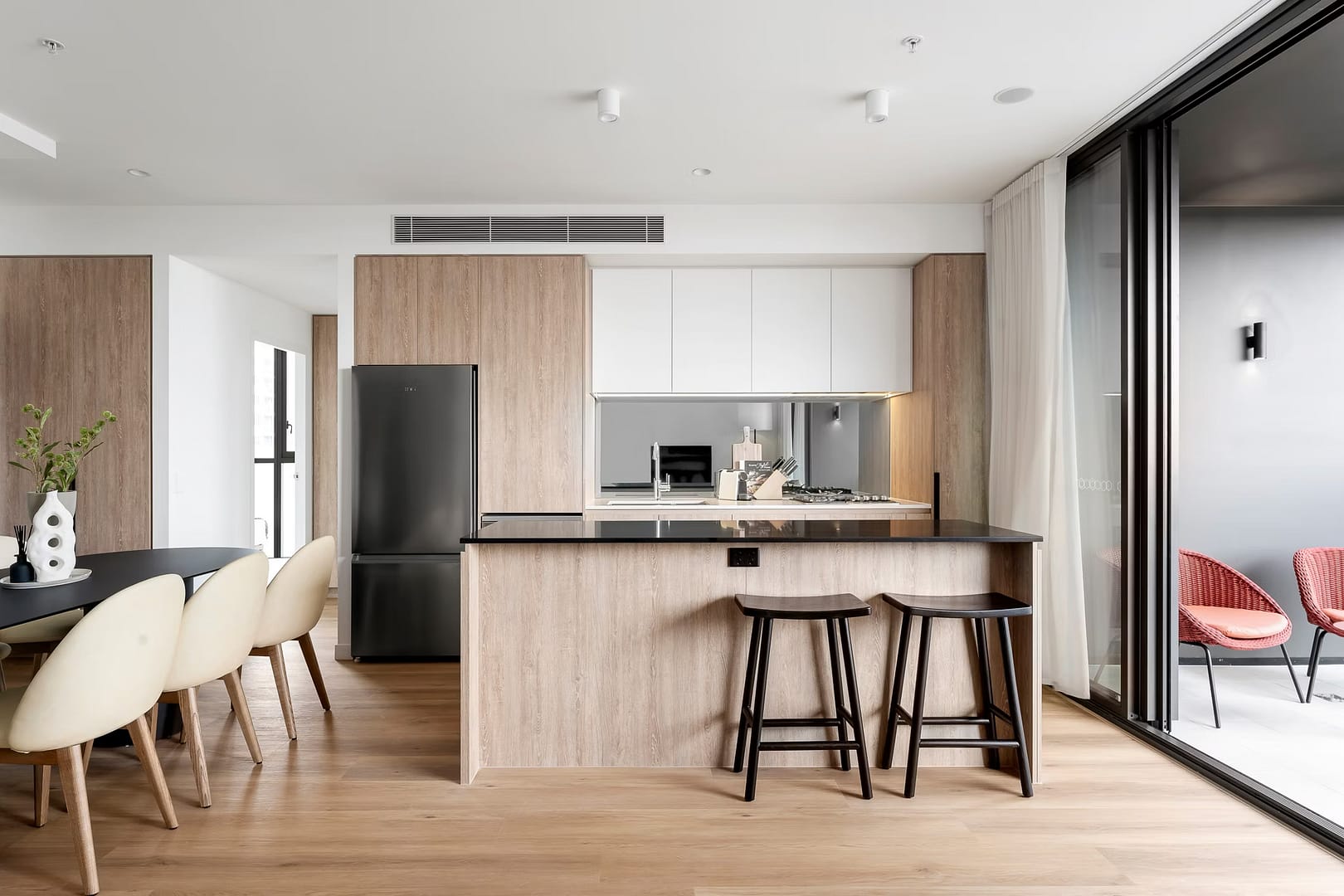 The property features a selection of contemporary one-, two-, and three-bedroom apartments, each designed with open-plan layouts, stylish furnishings, and an abundance of natural light. Every apartment includes a fully equipped kitchen complete with an oven, stovetop, microwave, dishwasher, and full-sized refrigerator, making self-catering simple and convenient. Guests can also enjoy in-unit laundry facilities, including a washer and dryer, as well as air conditioning, flat-screen TV, and complimentary high-speed Wi-Fi. Bedrooms are furnished with premium linen and ample wardrobe space, while living areas open onto private balconies in many units, offering fresh air and views of the surrounding neighborhood. The apartments are serviced weekly, ensuring a clean, comfortable, and well-maintained stay for all guests.