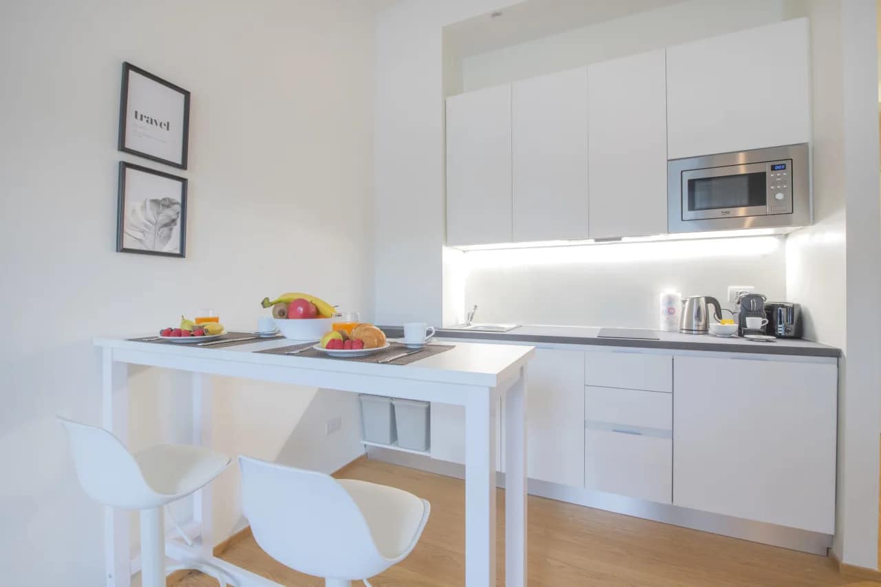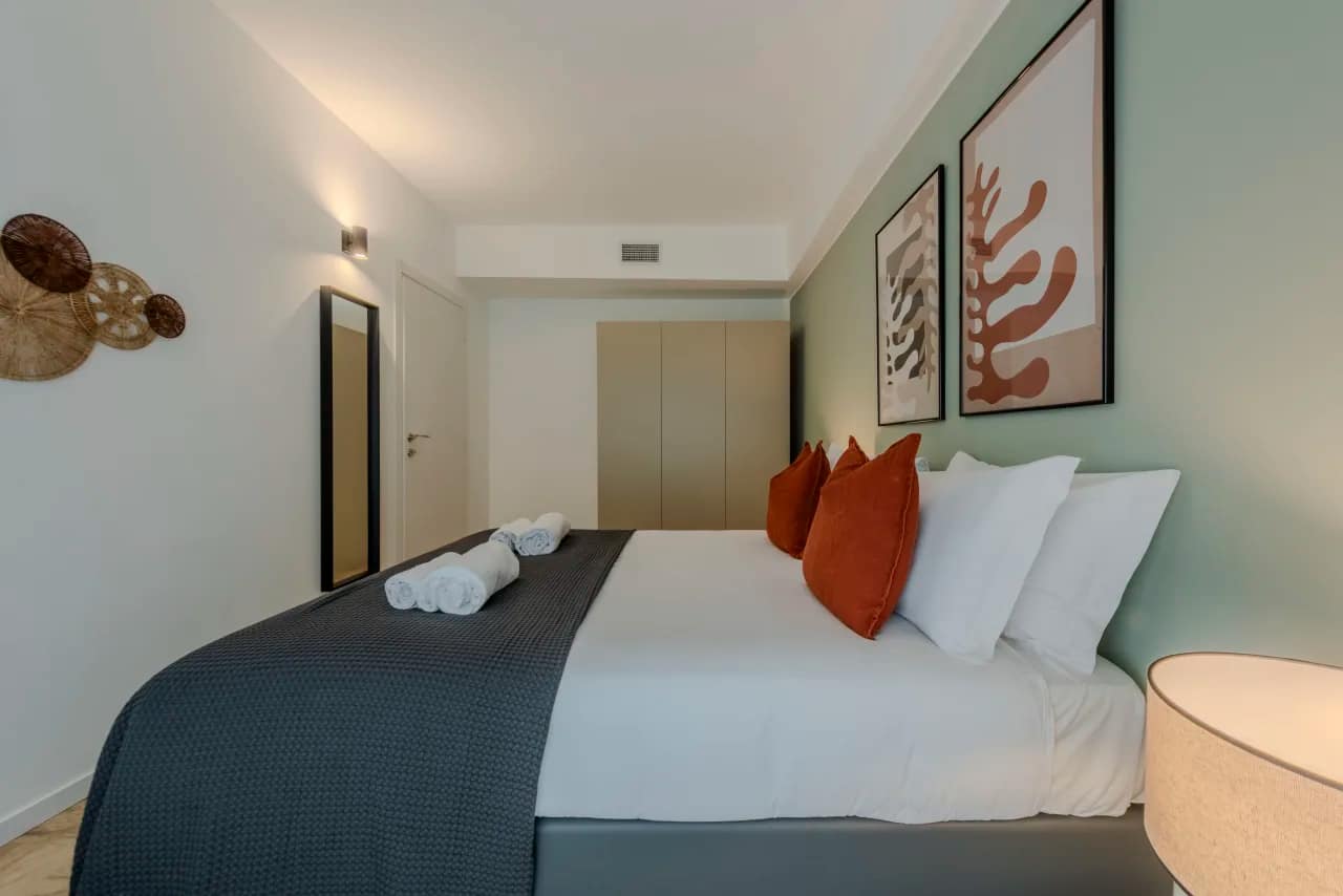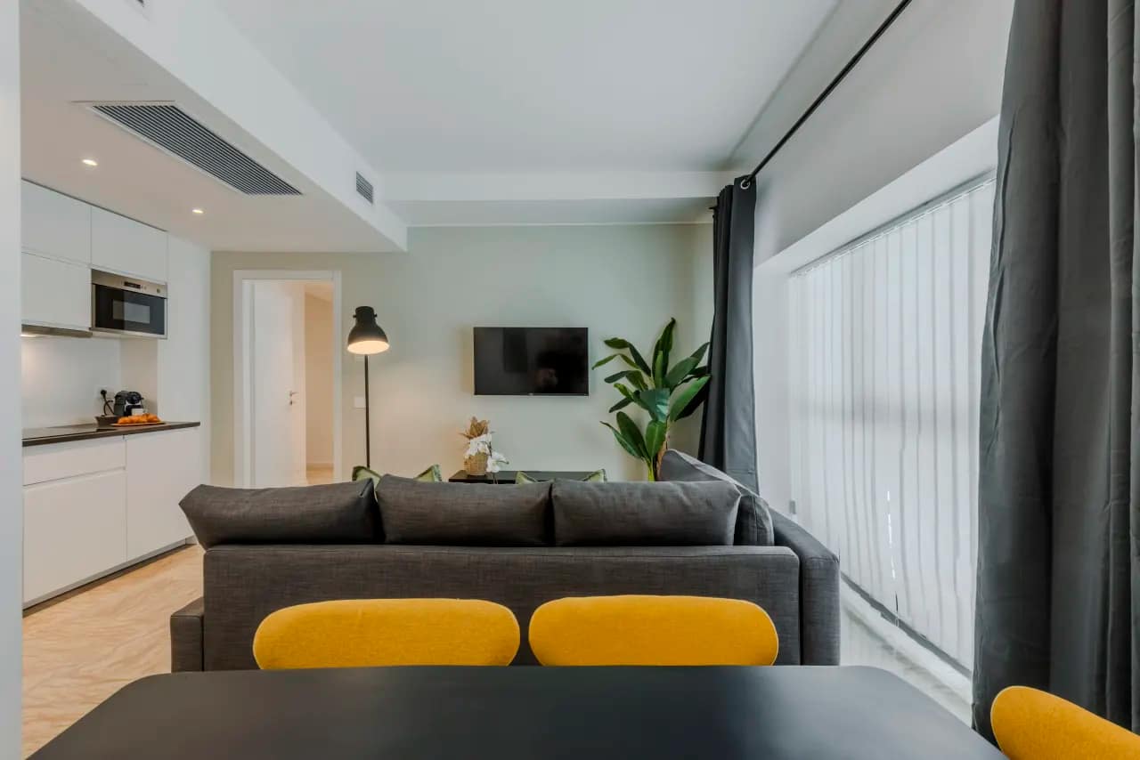Each apartment is thoughtfully designed for both comfort and functionality, with layouts that include either one or two bedrooms and a modern bathroom. The interiors blend soft, neutral tones with sleek furnishings and natural materials to create a calm, sophisticated atmosphere. Open-plan living and dining spaces provide a welcoming setting for relaxation, while fully equipped kitchens include a refrigerator, oven, stovetop, microwave, dishwasher, coffee machine, and essential cookware—ideal for guests who enjoy preparing their own meals. Additional features such as high-speed WiFi, flat-screen TV, premium linens, and in-unit laundry facilities enhance the convenience of longer stays. The apartments also feature air-conditioning, comfortable bedding, and bright windows that fill the rooms with natural light. Designed to feel like a true home-away-from-home, these apartments cater equally well to solo travellers, couples, and small families.