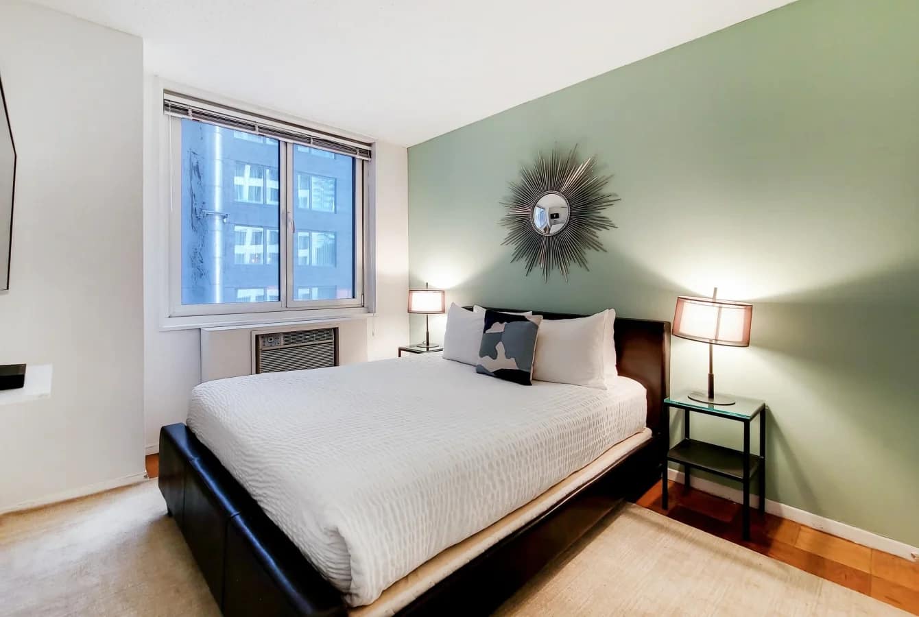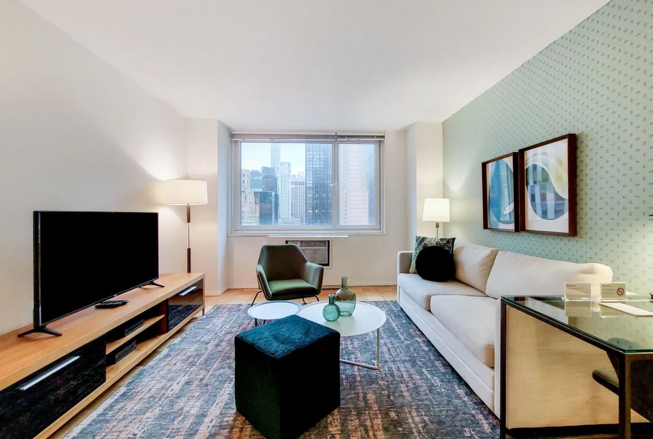 This inviting and contemporary one-bedroom, one-bath apartment is perfectly situated in the vibrant neighborhood of Midtown West, Manhattan. Combining urban sophistication with everyday comfort, the residence offers an ideal New York City living experience for both short and extended stays. Featuring elegant hardwood floors throughout, a fully equipped kitchen with sleek, modern appliances, and a spacious queen-size bed, this apartment is designed for restful nights and effortless city living. Large windows fill the space with natural light and offer dynamic views of Midtown Manhattan, while the open-concept layout creates an airy, welcoming atmosphere that makes every inch feel expansive and comfortable.