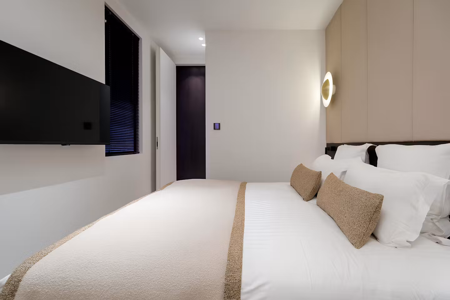 Inside, the apartment is finished with refined, architect-designed interiors. A calm palette of natural tones and rich textures runs throughout, creating a modern yet inviting space. The open-plan living area flows seamlessly into a sleek marble kitchen and a dining space ideal for relaxed evenings at home. Both bedrooms feature en-suite marble bathrooms and generous built-in storage, offering comfort and privacy in equal measure. A workspace, high-speed Wi-Fi, lift access and full laundry facilities make it as practical as it is stylish.