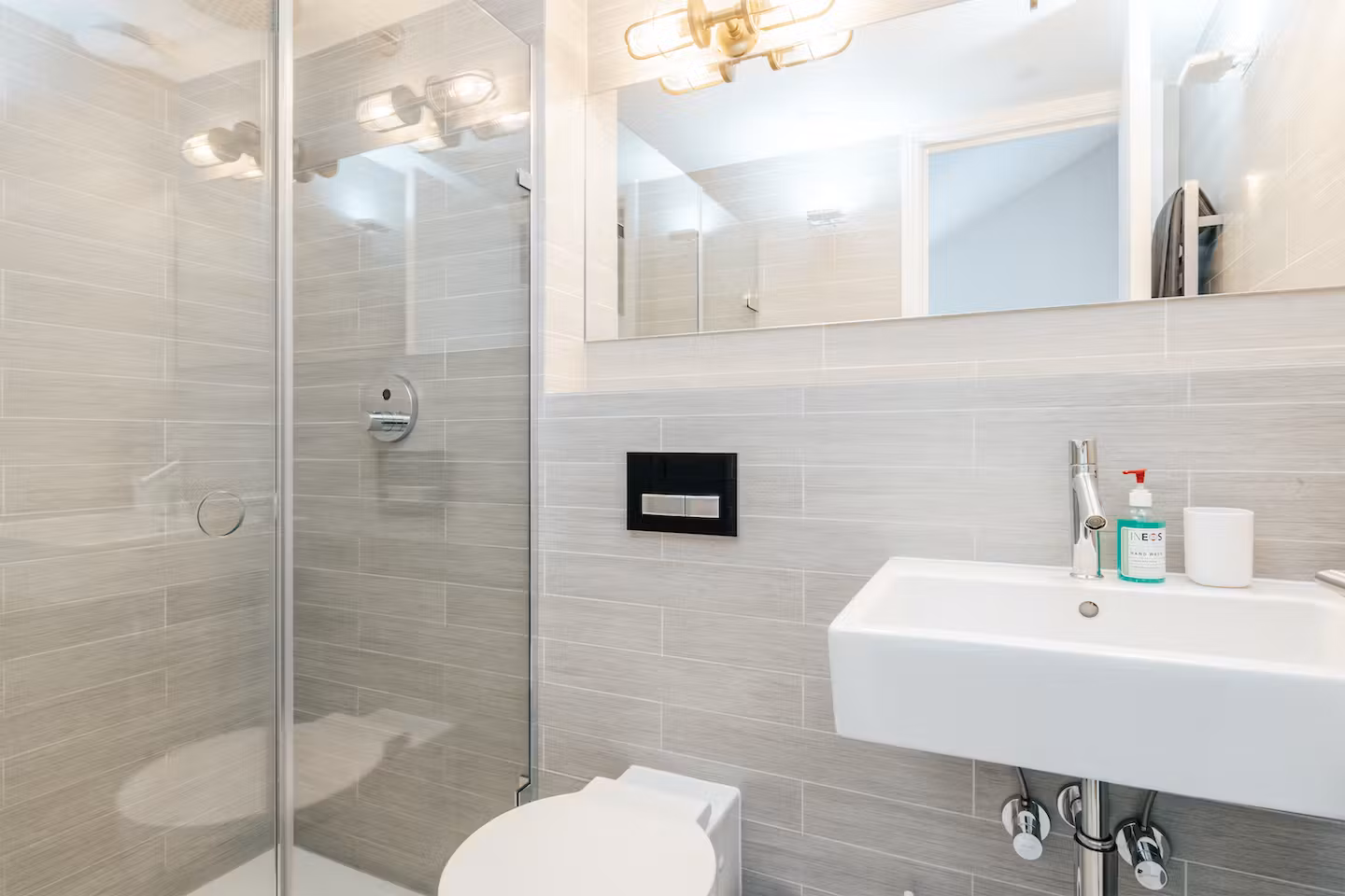 Upstairs, the bedrooms are thoughtfully styled with soft palettes, plush bedding, and ample storage. The primary suite is particularly impressive, with a hotel-worthy soaking tub positioned near a large window—a luxurious spot to begin or end the day. The other bedrooms are equally calming, and the home’s three modern bathrooms make group stays seamless. Outside, you’ll find a small terrace with seating—ideal for morning coffee or an evening moment of calm, but not the focal point.