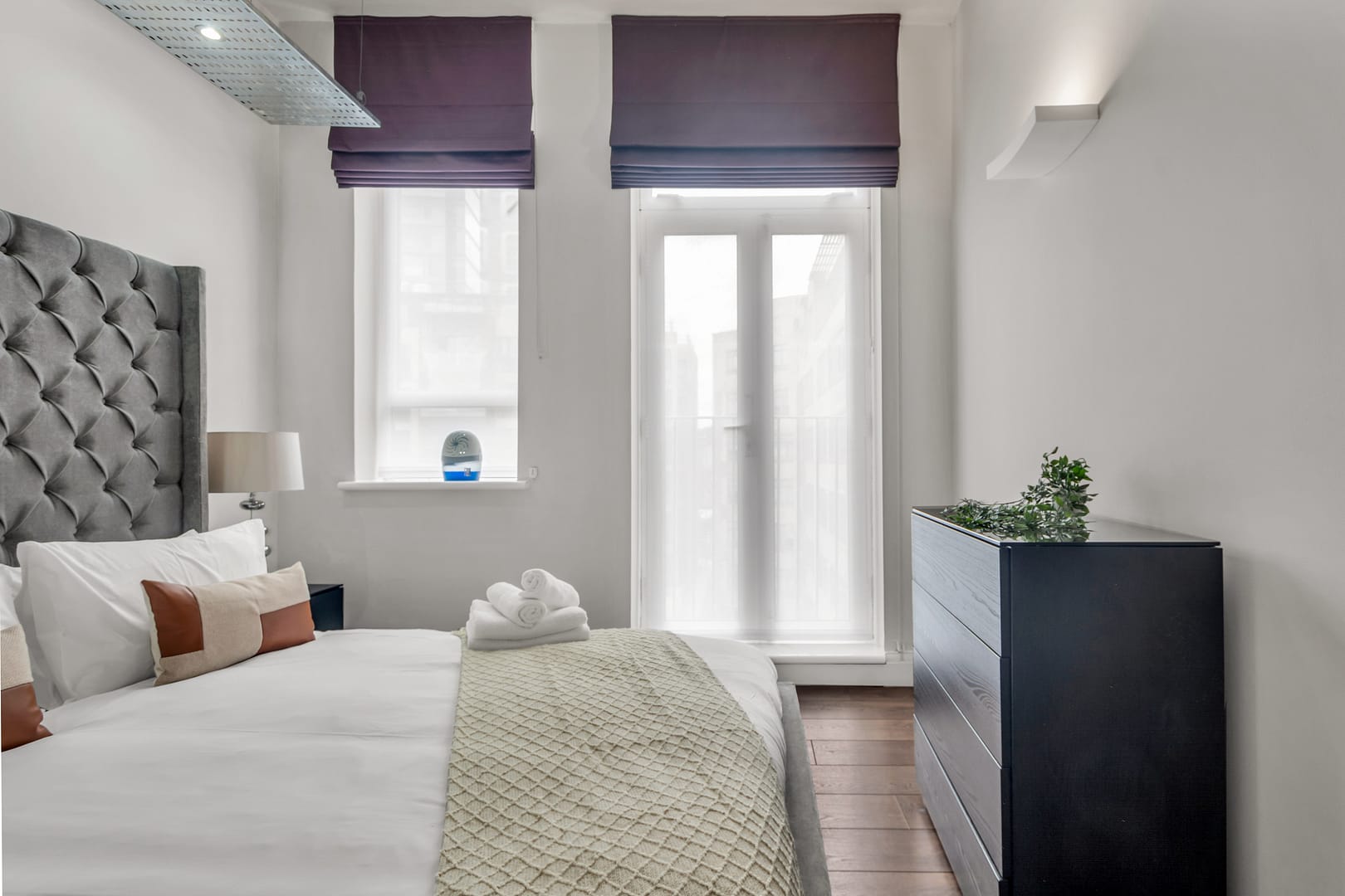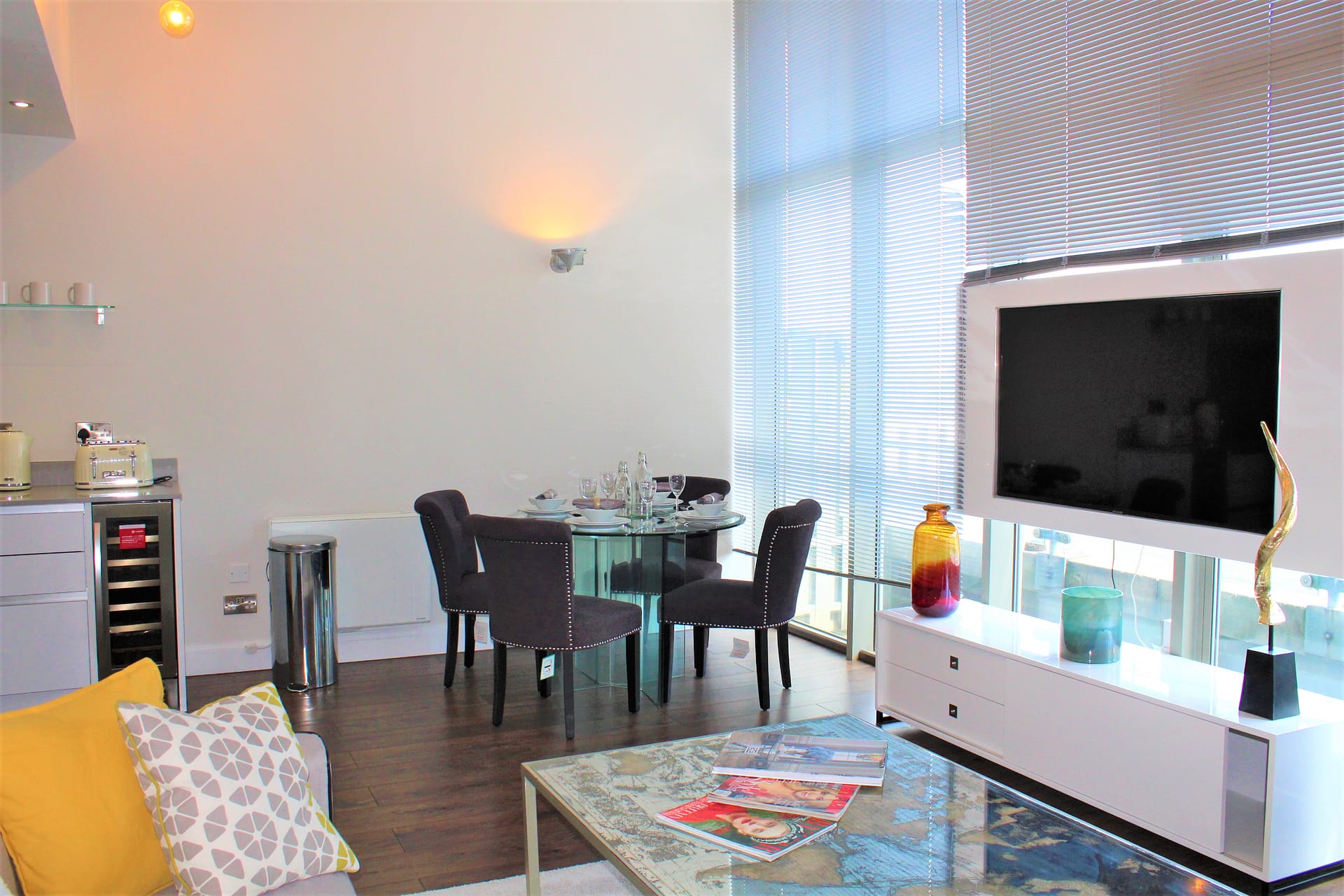 Inside, the Old Street Penthouse Apartment is all about modern design and open living. Expansive windows flood the space with natural light, while high ceilings and a neutral palette amplify the apartment’s sense of calm and airiness. The fully equipped kitchen includes premium appliances and everything needed for longer stays, while the living and dining areas provide plenty of space to relax or entertain. High-speed Wi-Fi, a Smart TV, and in-unit laundry facilities come as standard. The bedroom is a private retreat, featuring luxury linens and thoughtful touches throughout. Whether you’re working remotely, recharging between meetings, or planning an evening out in Shoreditch, the penthouse blends functionality with a refined urban feel.