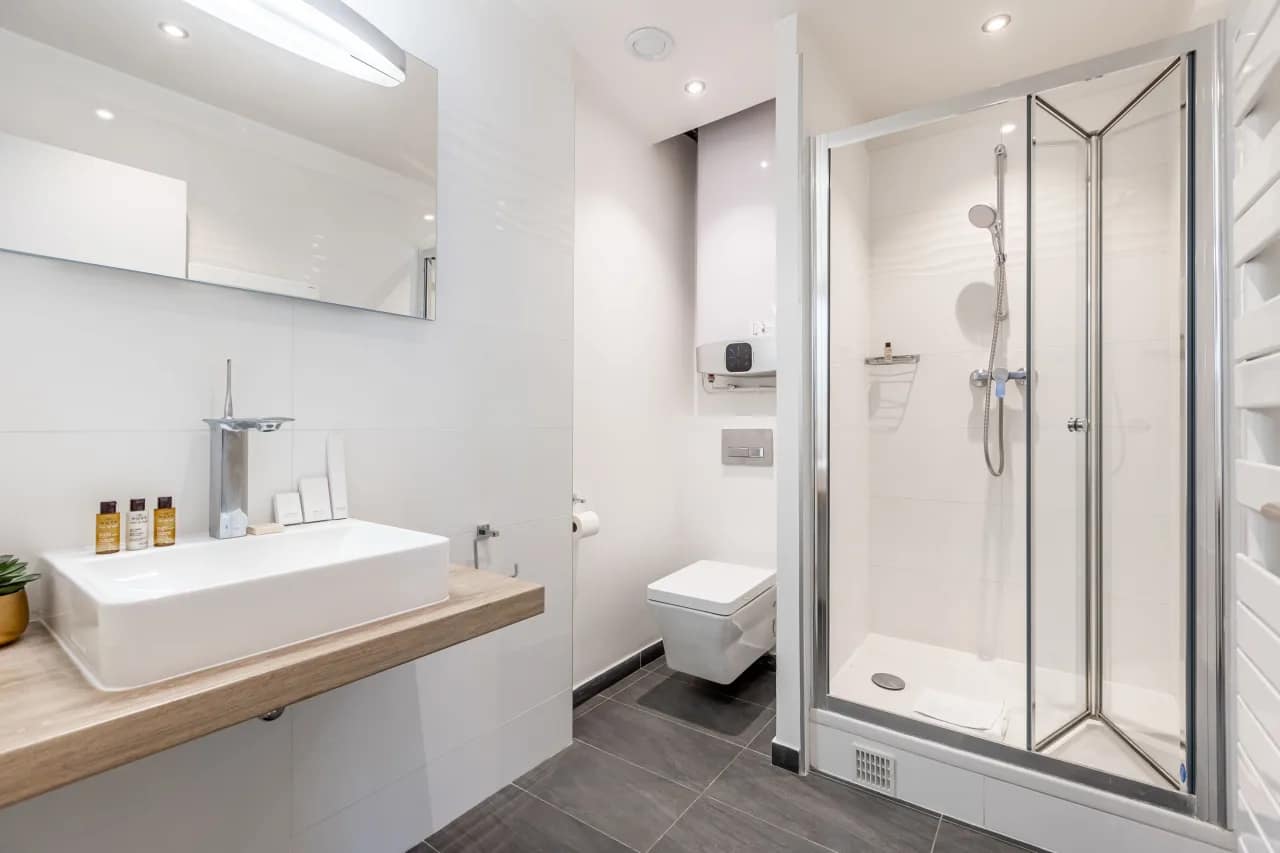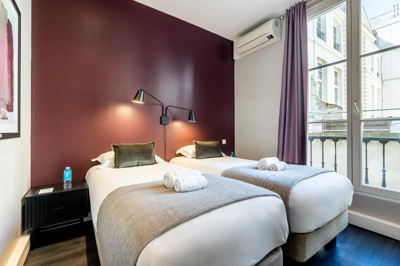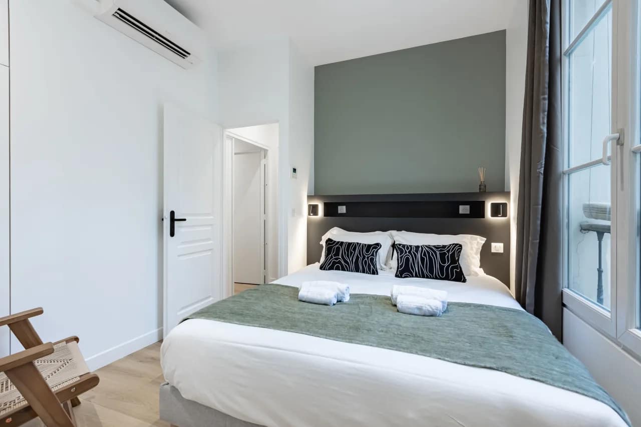 Here in the chic Opera-Grands Boulevards neighbourhood, the elegant three-bedroom Paris Opera House Apartments capture Paris’s old-world glamour while offering modern comforts. With high ceilings, tall windows, and recessed bookshelves, our local interior designer has transformed the space into a stylish mansion in the heart of Paris. Flowing drapery, lush textiles, and carefully selected furniture create an atmosphere of sophistication and warmth. The fully equipped kitchen is perfect for gourmet French cooking, featuring a stove, oven, microwave, fridge, and all essential cookware. The open-plan dining and living area provides a comfortable setting for gatherings, while the three bedrooms offer restful retreats with premium beds and linens. The single bathroom is modern and functional, featuring high-quality towels and toiletries.