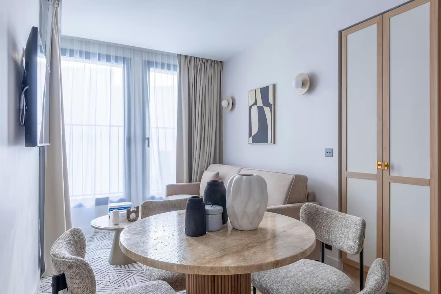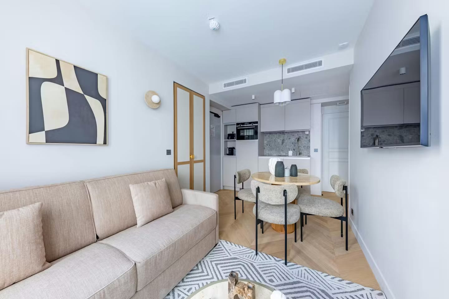 Inside, the layout provides an unusual amount of flexibility and space for a central Paris home, with two separate living areas and two kitchens – ideal for couples travelling together or families seeking a touch of independence. The open-plan living and dining area features sleek furnishings, natural textures and a gentle, soothing palette. Both bedrooms are comfortably appointed, and each is supported by its own bathroom. For business travellers or those blending work and leisure, the dedicated desk and high-speed Wi-Fi create a seamless remote working experience. Meanwhile, the shared building gym and a private balcony add thoughtful touches that elevate everyday routines.