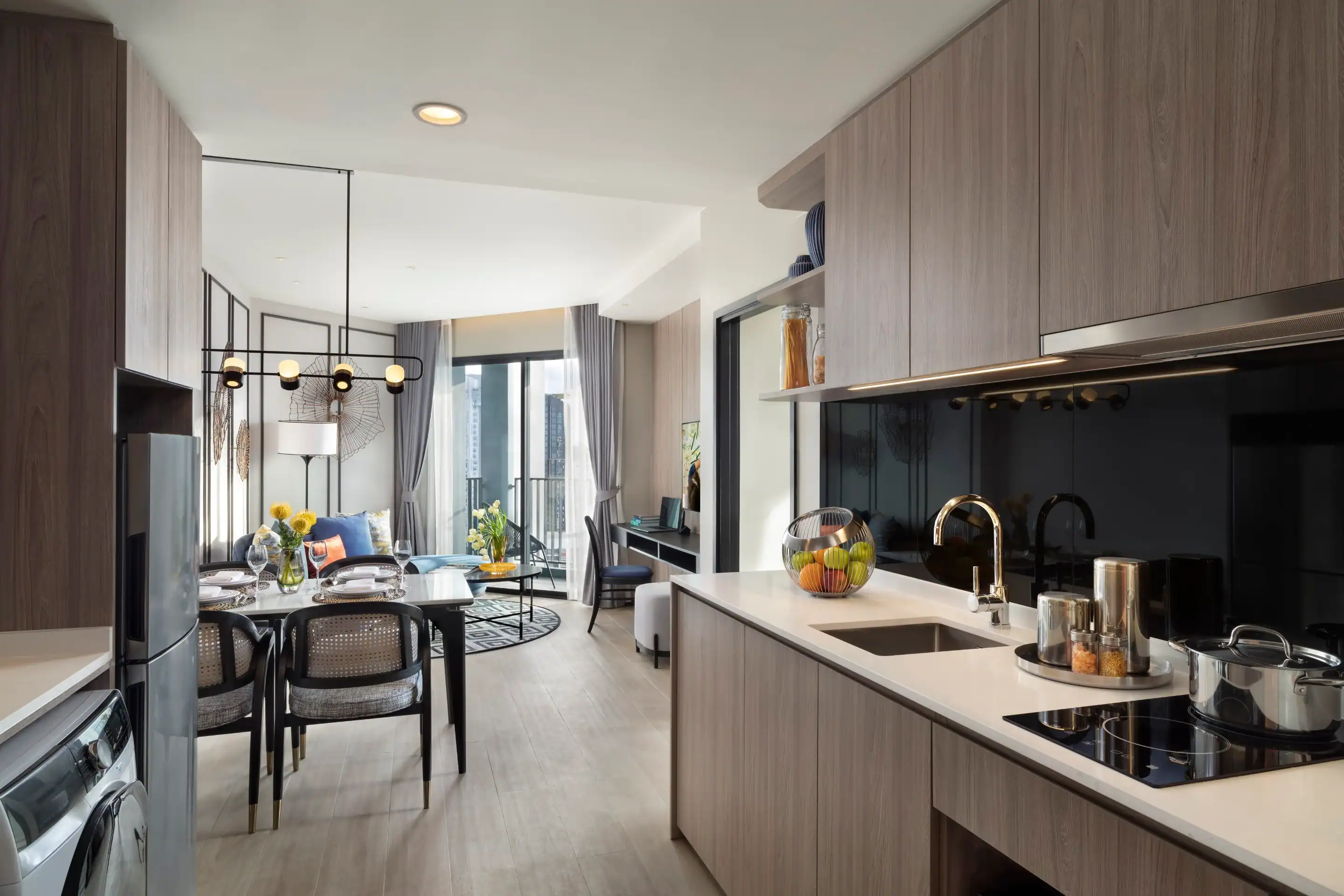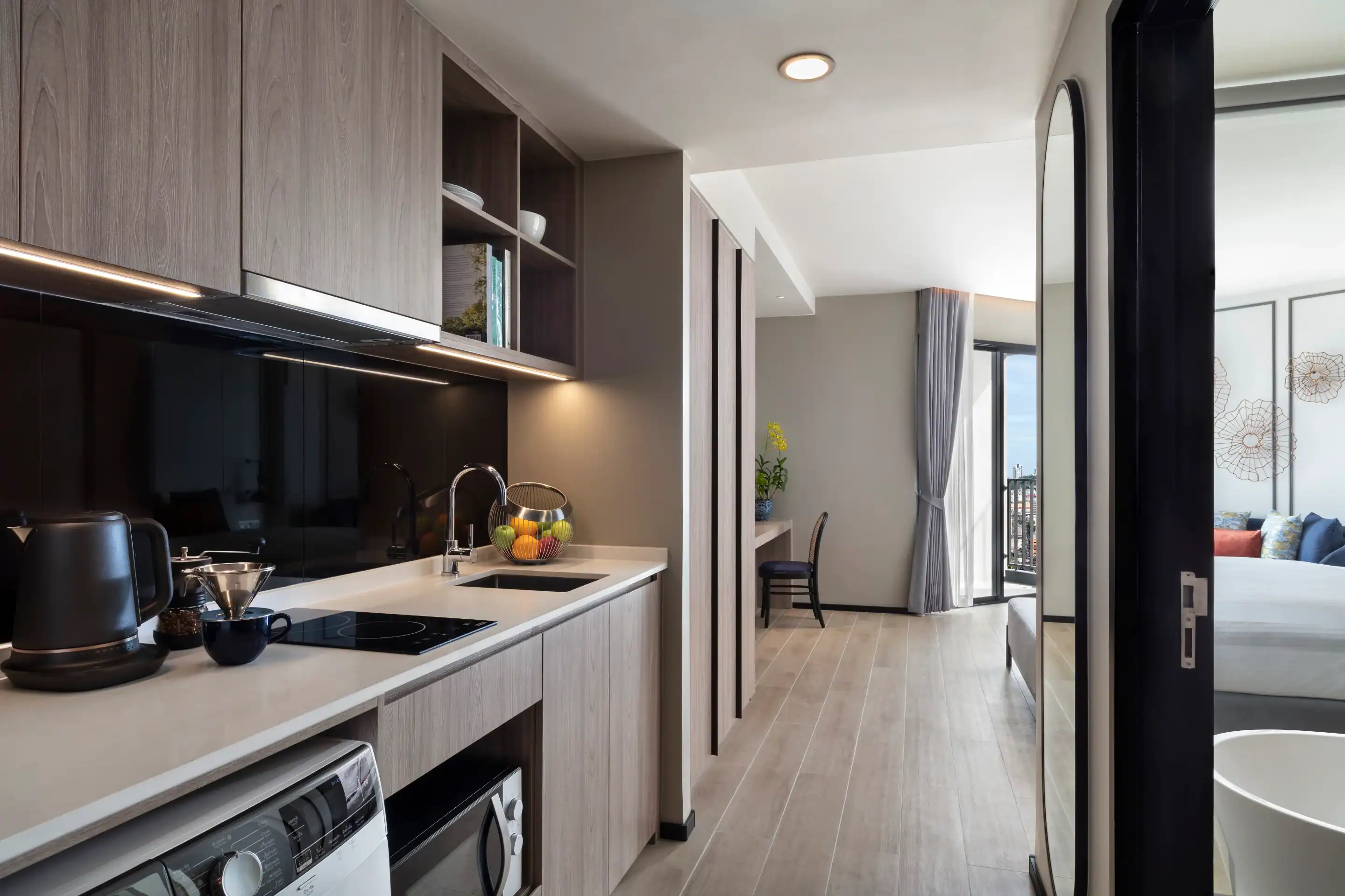 The aparthotel features a variety of fully furnished serviced apartments designed to support both short stays and extended residencies, with layouts that include studios as well as spacious one- and two-bedroom units. Each apartment is equipped with practical amenities such as high-speed Wi-Fi, air conditioning, fully equipped kitchens, and in-room laundry facilities, providing guests with the flexibility and comfort of independent living. Spacious living and dining areas offer inviting environments for relaxation, remote work, or everyday routines, while contemporary interiors and thoughtful design details help create a warm, home-like atmosphere. These well-appointed living spaces cater to a wide range of traveller needs, from solo visitors and couples to families and long-stay guests.