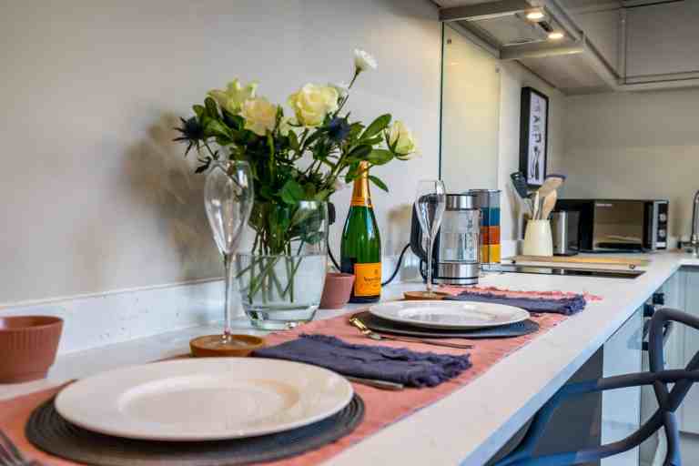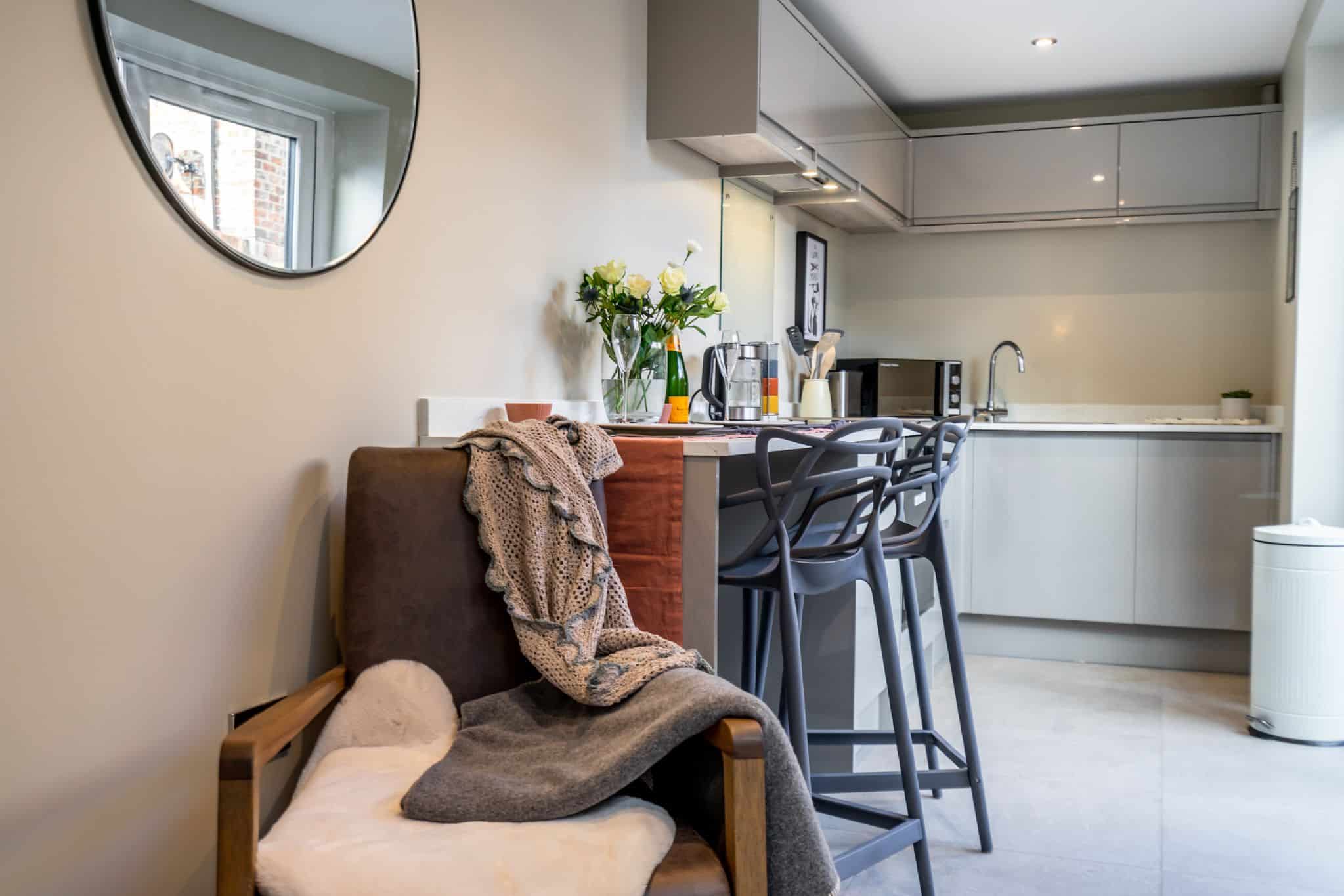 Penley’s Grove Street Cottage is a chic, one-bedroom retreat that has been finished with comfort and style in mind. Tucked away in a quiet corner of York yet within walking distance of the city centre, this apartment is ideal for couples seeking a romantic getaway or solo travellers wanting a relaxing base. The fully equipped kitchen makes cooking simple and enjoyable, complete with modern appliances and a dishwasher for added convenience. A sleek breakfast bar provides a welcoming spot to start the day with coffee or breakfast, while the private courtyard offers a tall table and chairs for al fresco dining when the sun is shining. Whether you prefer home-cooked meals or takeaways, you’ll find this space a perfect balance of practicality and charm.