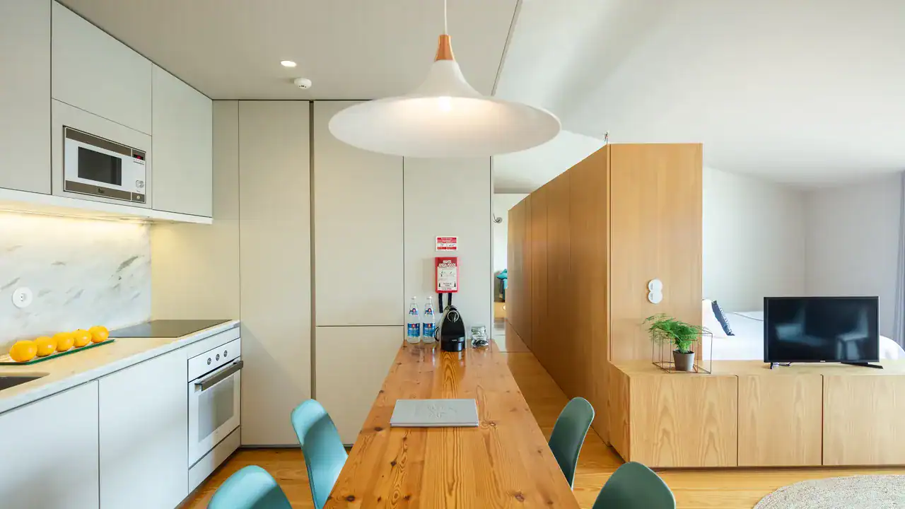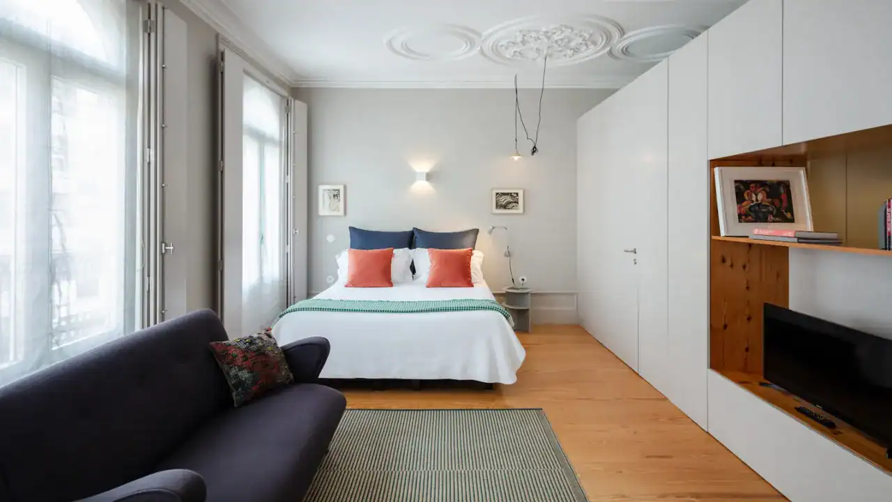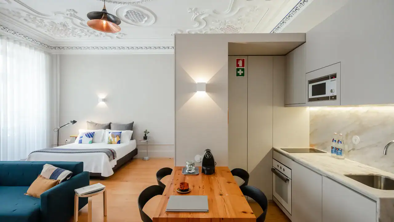 Inside each Porto Boavista Apartment, you will find a harmonious fusion of style and practicality. Apartments such as “Almada” offer a loft or mezzanine layout ideal for 2–4 guests, featuring a spacious living area, fully equipped kitchen, bathroom, and a charming mezzanine that delights younger guests (though with a lower-ceilinged upper level). The “Amadeo” studios, situated on the second floor, come with a large bathroom, kitchenette, separate dining area, and a balcony overlooking Rua da Boavista—perfect for morning coffee and people-watching baumhaus.pt. Across the board, amenities include free high-speed internet, bathrobes, hair dryers, TV, tea and coffee facilities, and air conditioning in some units.
