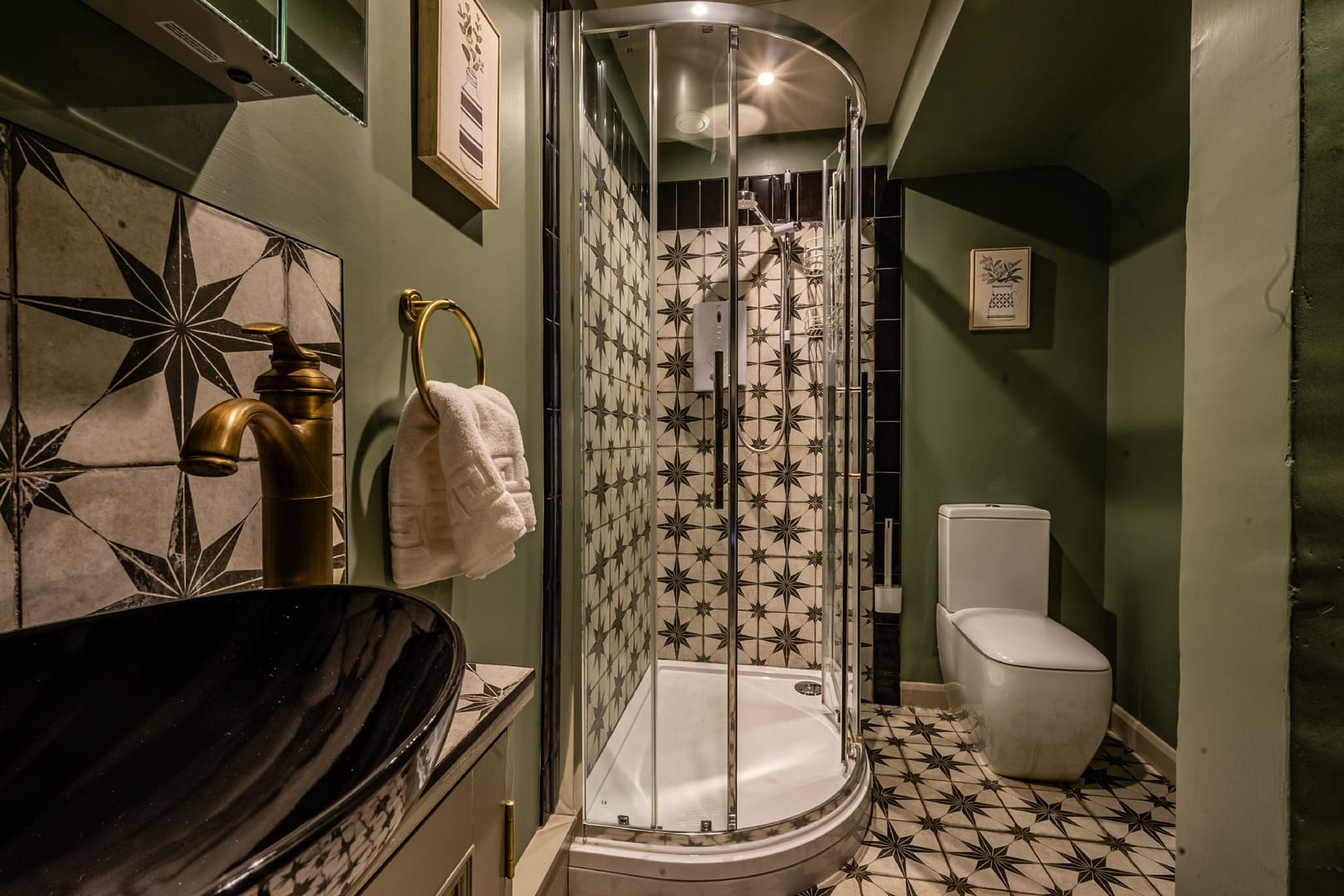 The ground floor is the heart of the home, featuring a spacious, magazine-worthy kitchen fitted with top-of-the-line appliances and a dining area that comfortably seats eight. Perfect for preparing shared meals, it blends function with elegance. Adjacent to the kitchen is the main living room, where a large wraparound sofa and Smart TV invite guests to unwind. From here, French doors open onto a private patio furnished with outdoor seating—an ideal spot for enjoying warm summer evenings with a glass of wine. Upstairs, the first floor continues to impress with a luxurious family bathroom offering a freestanding bath, walk-in shower, and dual sinks, along with the master bedroom, which includes a sumptuous king-size bed, wardrobe, and its own wall-mounted TV.