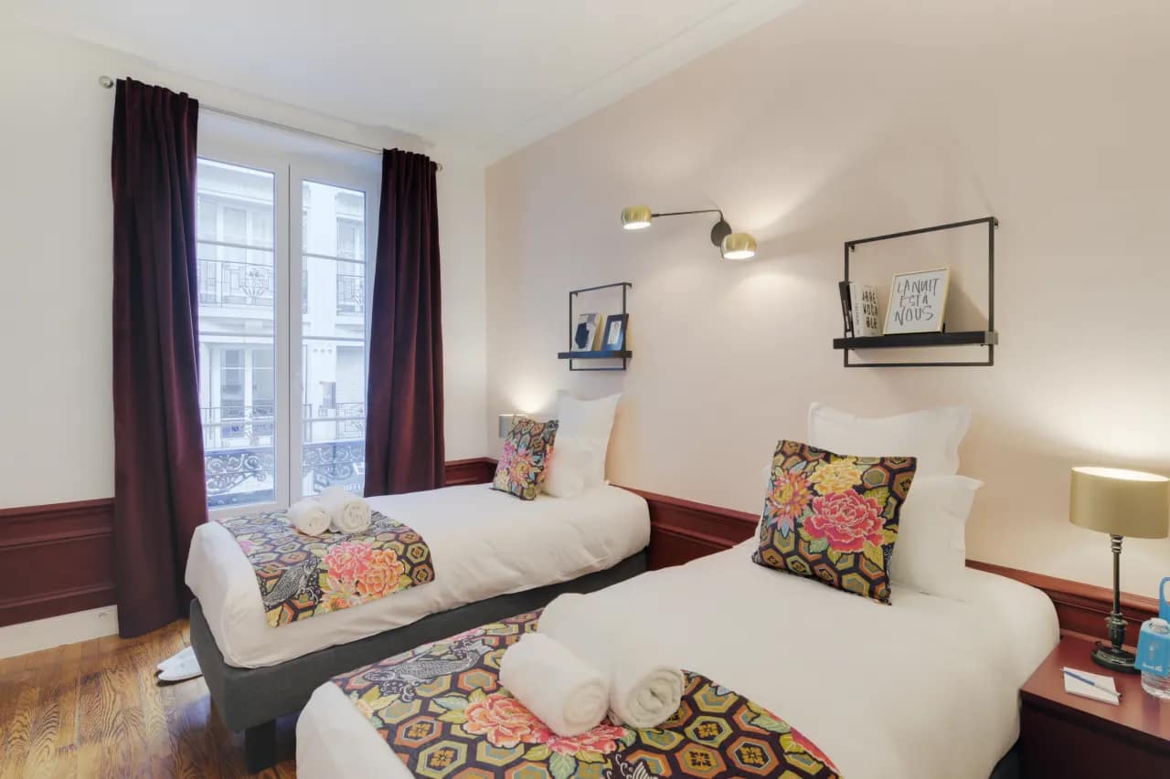 To enhance your stay, the apartment is equipped with premium amenities such as free high-speed WiFi, cable TV, hotel-quality beds and linens, luxury toiletries, and a Nespresso machine. Guests will also appreciate thoughtful extras, including luggage storage, baby equipment upon request, and local tips to help you experience Paris like a resident. The modern kitchen features a full range of cookware, utensils, and appliances, while additional comforts such as a safe, slippers, hair dryer, ironing facilities, and washing machine ensure convenience during longer stays. A smart lock system and digital keys provide security and flexibility, while large windows offer delightful city views that connect you to the vibrancy of the neighbourhood. Combining Parisian charm with contemporary comfort, the Rue d’Artois Apartments is the perfect choice for families and groups seeking an elegant oasis in the heart of Paris.