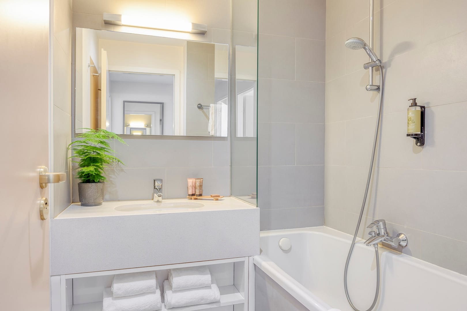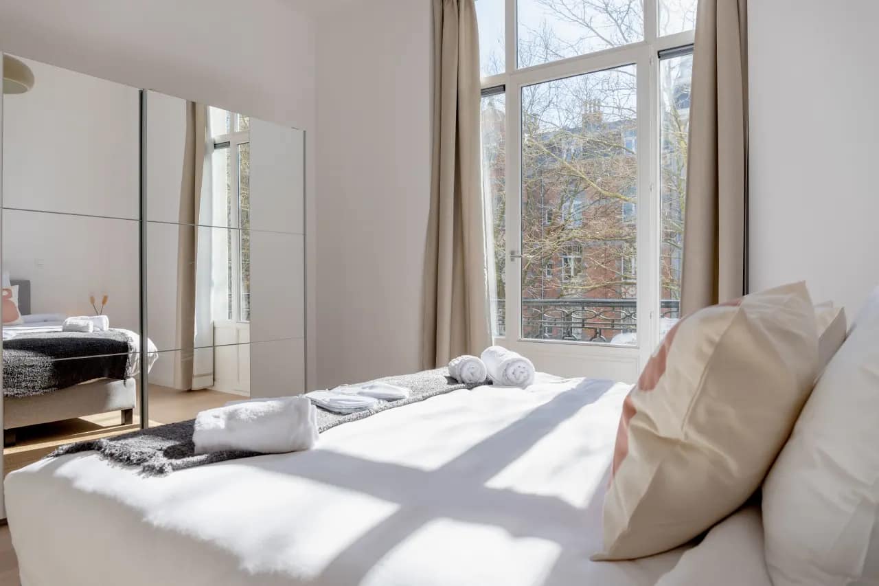 All units include hotel-quality beds with premium linens, modern bathrooms stocked with high-end toiletries, and fully equipped kitchens with everything from a Nespresso machine and dishwasher to cookware, oven, and microwave. Additional conveniences such as free WiFi, cable TV, washer/dryer, iron, safe, and digital keys ensure both short and long stays are seamless. Select apartments also feature balconies, private terraces, or garden access, creating the perfect outdoor escape. Please note that some bedrooms are located on the suplex floor, and one bedroom has an internal window overlooking the living room, adding unique architectural character.