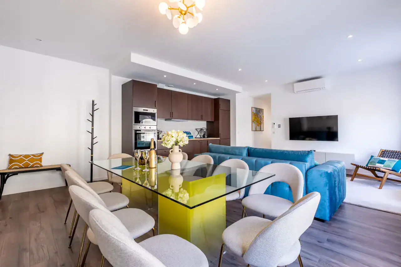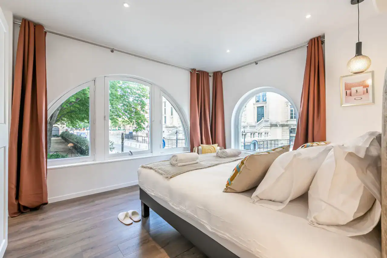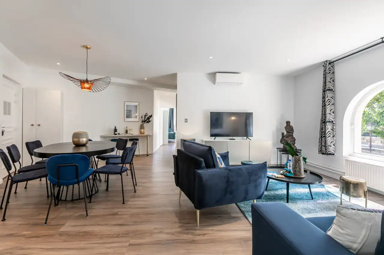 Ideally situated in the heart of Paris, the Sainte-Chapelle Apartments offer two exquisite residences designed with refined Parisian elegance and comfort. Guests can choose between the expansive 4-bedroom, 3-bathroom apartment (117m²) for up to 10 guests or the charming 3-bedroom, 2-bathroom apartment (103m²) for up to 8 guests, each thoughtfully styled by our local interior designers to capture the glamour of French living. Expansive windows bathe the interiors in natural light, while elegant furnishings, sophisticated décor, and fully equipped kitchens create a welcoming environment for families and groups. Guests will also enjoy a full range of modern comforts, including air conditioning, a fully equipped kitchen with dishwasher and Nespresso machine, luxury bedding and high-end toiletries, digital keys with smart lock access, a washing machine, and thoughtful extras such as baby amenities on request, making your stay both effortless and indulgent.