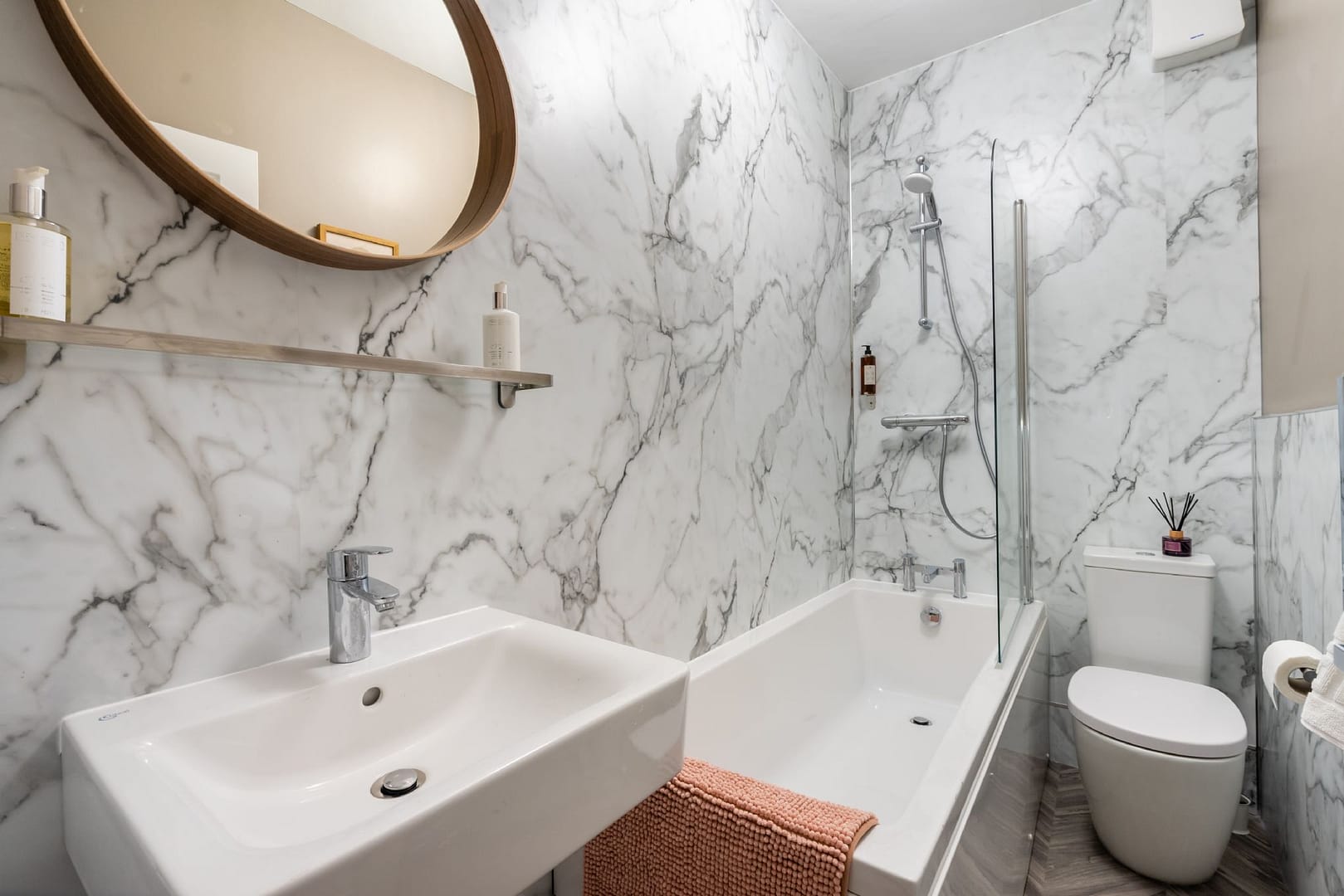 Upstairs, the property continues to impress with two stylishly furnished double bedrooms and a sleek family bathroom, complete with a freestanding shower. An additional office room on this floor provides the perfect setup for guests working remotely, offering both privacy and practicality. Rising to the top floor, you’ll discover the luxurious master suite, a spacious retreat featuring a king-size bed, wall-mounted TV, and its own impressive ensuite. The ensuite includes a freestanding bath, walk-in shower, and access to a walk-in wardrobe space, ensuring both indulgence and functionality. Every room has been thoughtfully decorated with contemporary touches, providing comfort and elegance at every turn.