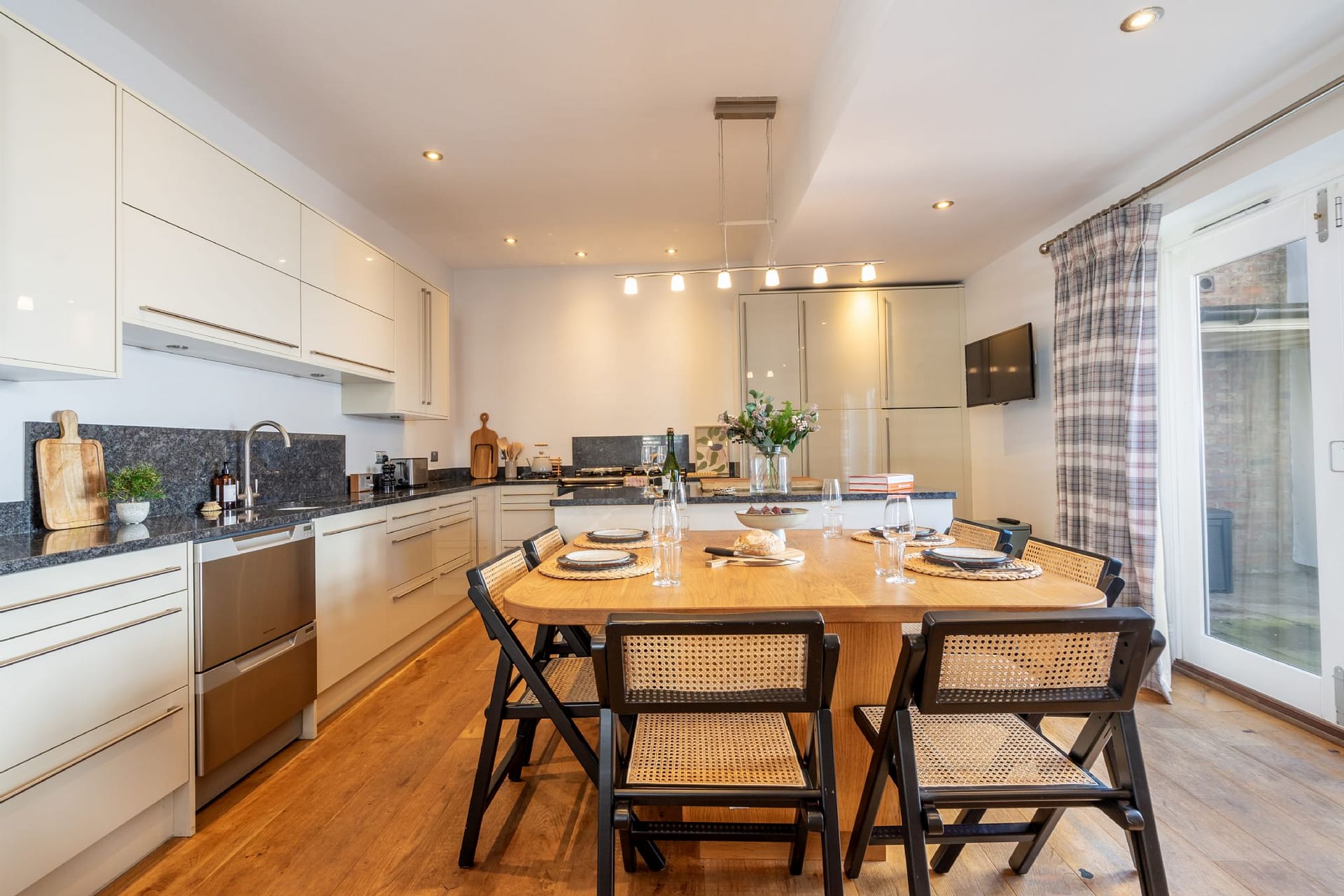 Perfectly positioned just a short stroll from York city centre, Scarcroft Road Apartments is a stunning three-bedroom home that combines modern luxury with generous space, making it ideal for families, groups, or those seeking an extended stay in the city. From the moment you step through the private entrance into the elegant tiled hallway, you’re greeted with a sense of sophistication and quality. To one side, the main living room offers comfortable seating for six and a wall-mounted TV, while to the other, a second reception room with an inviting L-shaped sofa and Smart TV provides an additional place to relax or entertain. The heart of the home lies in the spectacular kitchen and dining area, a beautifully designed space featuring granite worktops, a dining table for six, an AGA, an additional electric oven, gas hob, and even a wine fridge. From here, doors open onto an enclosed private patio, complete with outdoor seating for enjoying meals or unwinding in the fresh air. A separate WC on the ground floor adds convenience for guests.