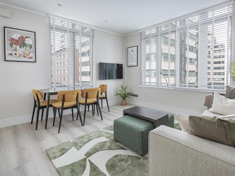 This beautifully presented One bed Serviced Apartment Tower Bridge offers an elegant retreat in the heart of London’s historic core. Set on a higher floor, the apartment is filled with natural light thanks to its floor-to-ceiling windows and open layout. The highlight is a spacious private terrace offering striking cityscape views — a rare urban bonus that adds genuine appeal for business and leisure guests alike. Whether you’re unwinding after meetings or easing into a weekend break, this thoughtfully designed space supports a smooth, comfortable stay.