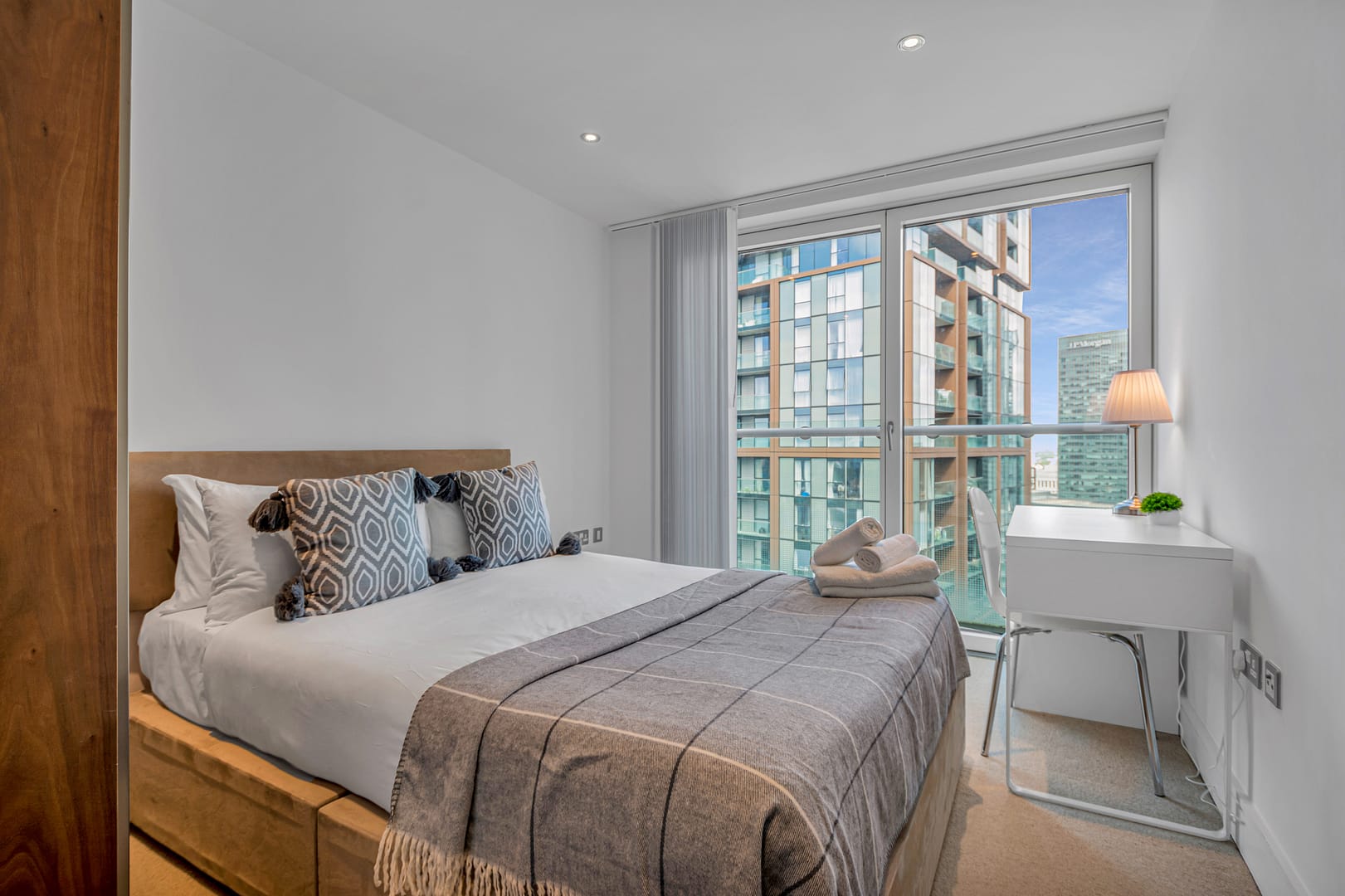 Some of the apartments in our Canary Wharf Executive collection are open plan one bedroom apartments meaning that there is a separate bedroom but with no door resulting in an open, flowing layout.