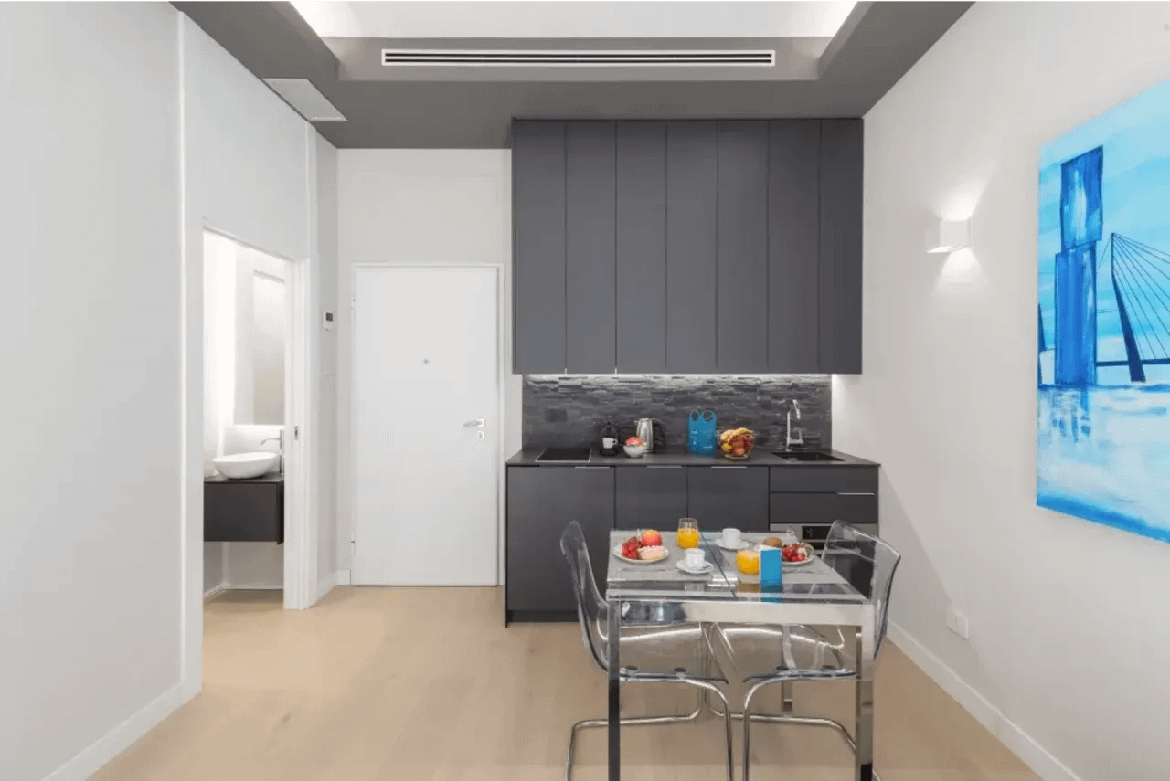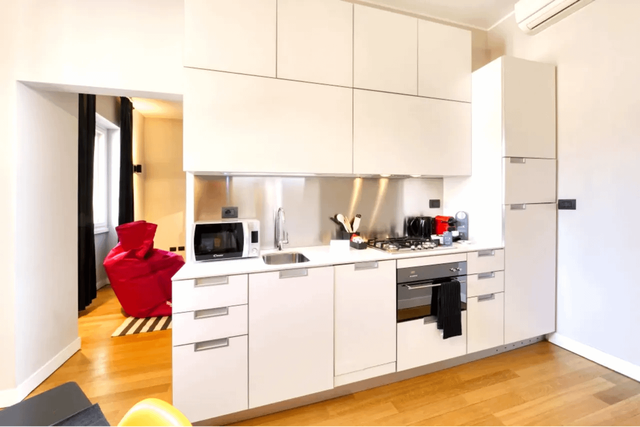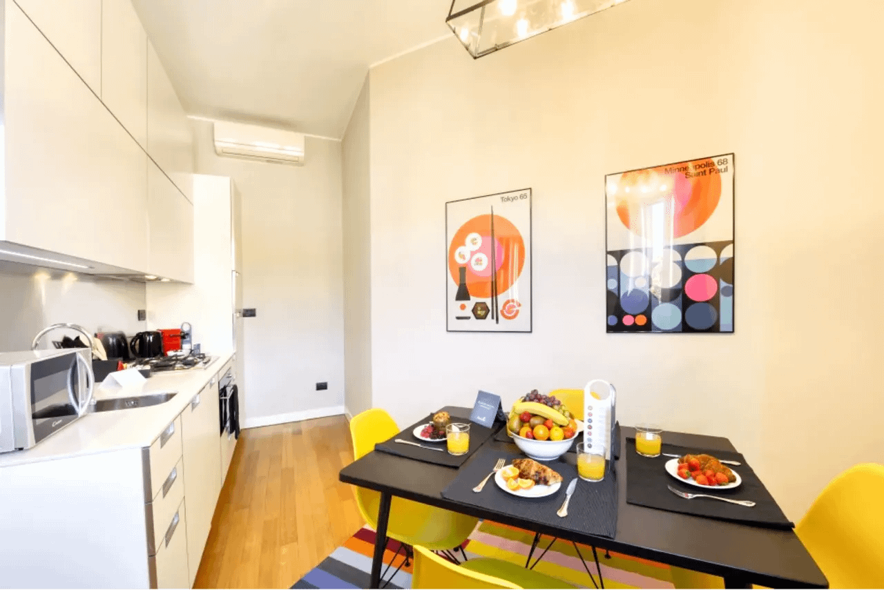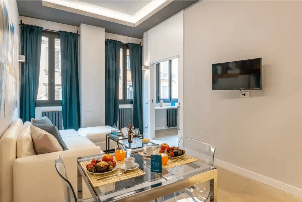 The apartments themselves are designed with comfort, style, and practicality in mind. Each unit offers modern amenities such as air-conditioning, free WiFi, flat-screen TVs, and well-equipped kitchen or kitchenette facilities that allow you to dine in when you want. Bathrooms are clean, well-furnished, often with good fixtures, and the furnishings balance modern minimalism with warm touches of Italian character. The rooms are sound-insulated, helping to buffer the buzz of Centro Storico while still letting you enjoy the energy of living in the centre of Milan. Some units have views over the castle or Parco Sempione—waking up to the silhouette of ancient towers or lush greenery can feel special. Lift access, shared utilities like laundry (where provided), and secure guest access add to the convenience for stays both short and longer.