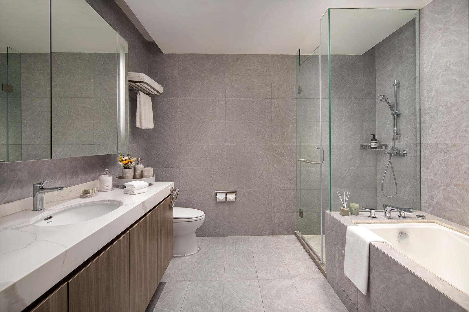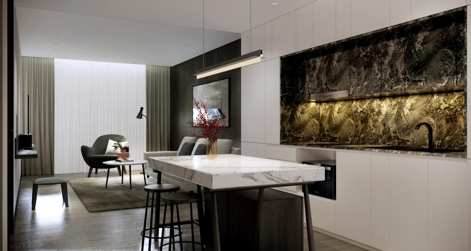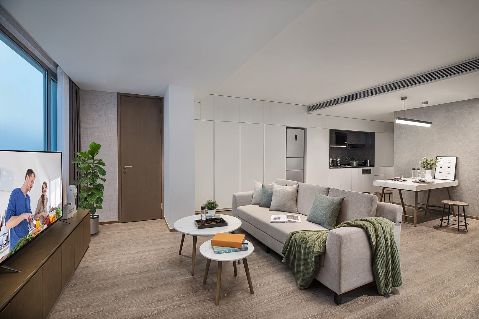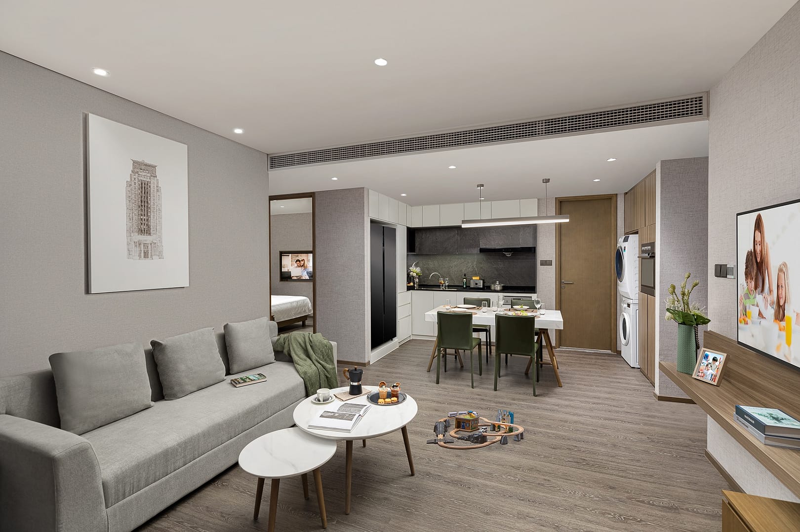 The aparthotel features approximately 460 well-designed serviced apartments, ranging from one-bedroom units of around 50–60 square metres to spacious three-bedroom layouts up to 135 square metres. Each apartment is fully furnished with modern interiors, including living and dining areas designed for comfort and functionality. Kitchens are fully equipped with a refrigerator, stovetop, microwave, and cookware, making it easy for guests to prepare their own meals. Bedrooms are outfitted with premium bedding and soundproofing for restful nights, while in-unit washer/dryer facilities, air conditioning, and high-speed internet ensure daily convenience. Many units also include balconies or terraces that overlook landscaped courtyards, offering peaceful views and a sense of connection with nature.