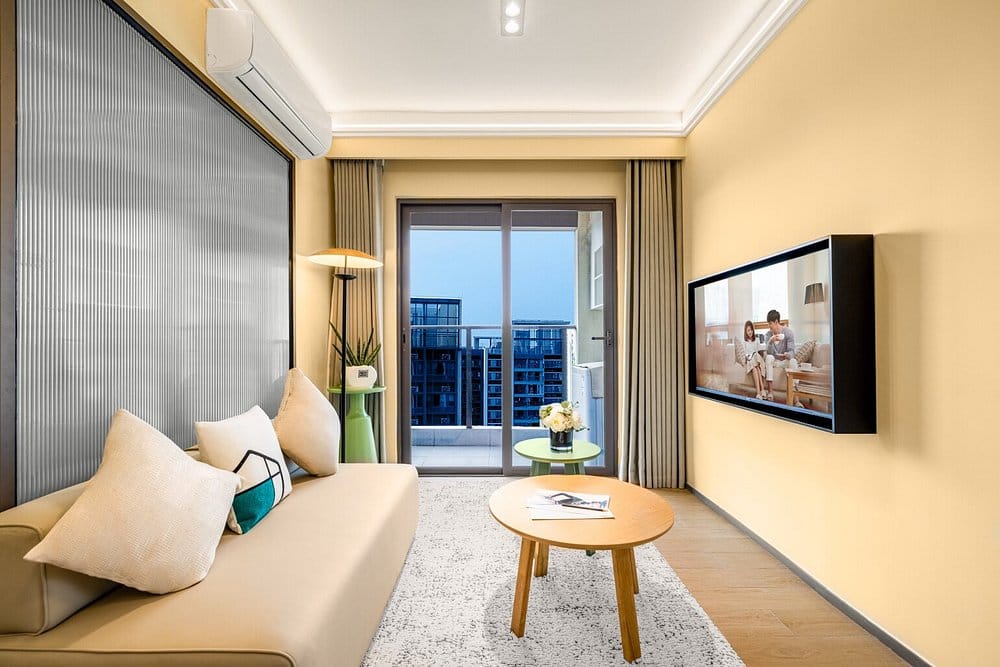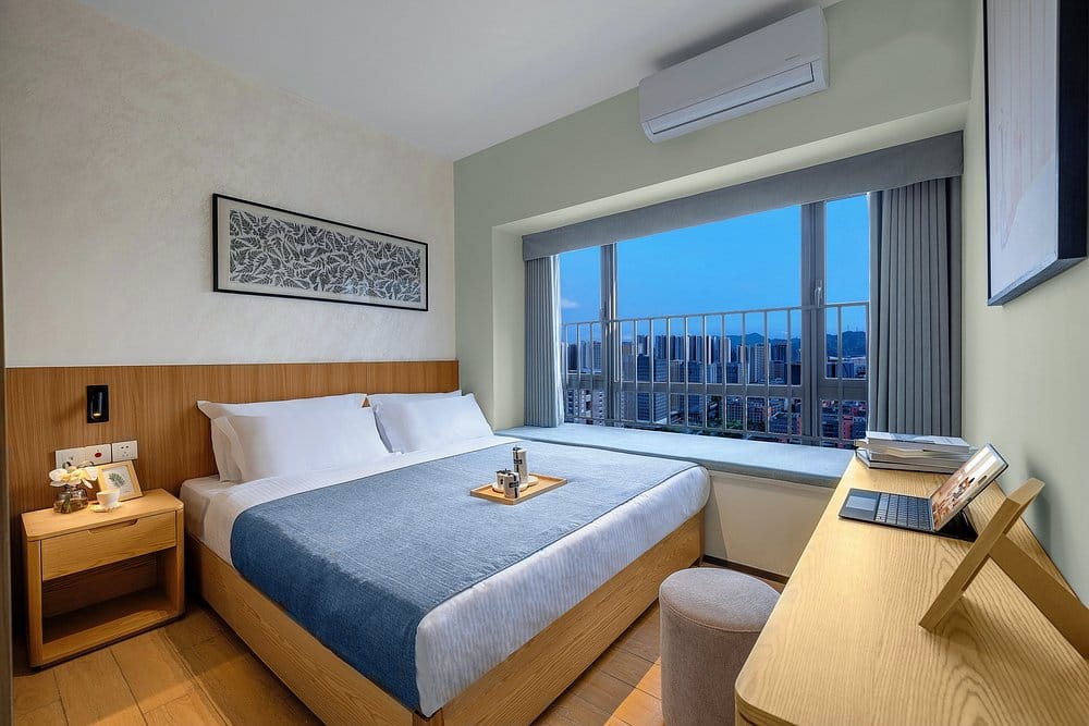 Shenzhen Guangming City Aparthotel features around 160 well-designed apartments, including one-bedroom deluxe and executive two-bedroom layouts. Each apartment is crafted to support both comfort and productivity: fully equipped kitchens, including modern appliances and cookware, allow for flexible living; separate dining areas give structure to mealtimes; and large windows fill the rooms with natural light and views of the surrounding city and green spaces. Apartments also include in‑unit washing machines, refrigerators, air-conditioning, and flat-screen TVs. High-speed broadband ensures that both remote workers and leisure guests stay connected.
