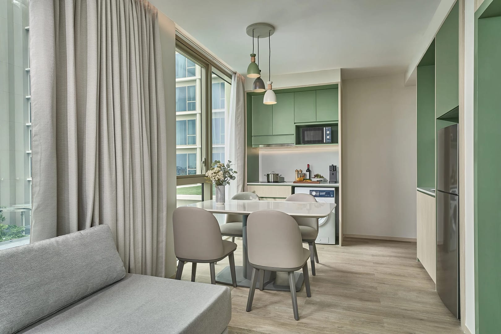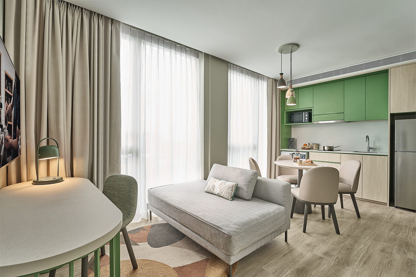 The aparthotel features a range of fully furnished serviced apartments designed to support both short stays and extended residencies, with layouts that cater to solo travellers, couples, and small groups. Each apartment is equipped with practical amenities including high-speed Wi-Fi, air conditioning, fully fitted kitchens, and comfortable living and dining areas that support everyday routines, relaxation, and remote work. Thoughtfully designed interiors and functional layouts create welcoming, home-like environments where guests can unwind after work or exploration, while independent living features help make longer stays more comfortable and flexible.