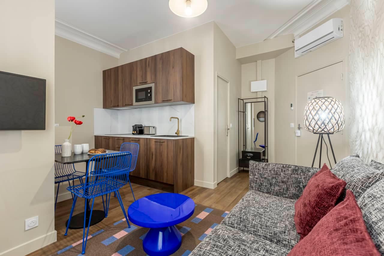 Guests can choose between two distinct options. The one-bedroom apartment (41m², up to 4 guests) offers a spacious bedroom, inviting living area, and a fully equipped kitchen, perfect for families or small groups. The studio (24m², 2 guests) is compact and intimate, ideal for couples or solo travellers seeking a cosy retreat. Both options include premium amenities such as free WiFi, cable TV, hotel-quality beds and linens, luxury toiletries, and a Nespresso machine. Additional features include modern kitchen appliances, a safe for valuables, and elegant décor that reflects Parisian style. Whether sipping coffee in the morning, unwinding after a day of sightseeing, or planning the next adventure, the Square Albert Besnard Apartments provide the perfect Parisian escape.
