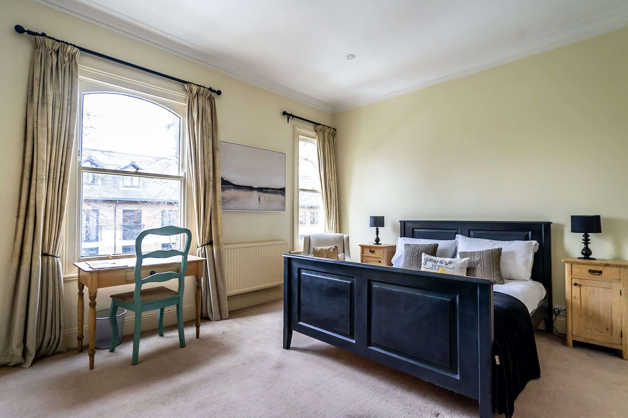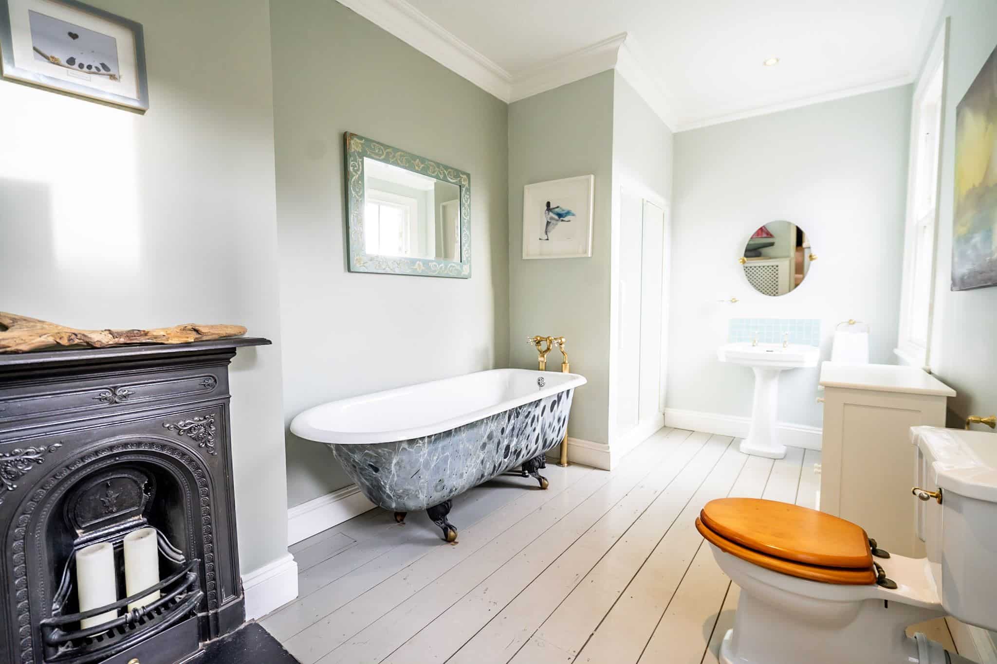 The apartment’s interior combines classic style with modern amenities. On the ground floor, the lounge features a wood-burning stove, hardwood flooring, and an LCD TV, creating a cosy space for relaxing evenings in. Adjacent to the lounge is a separate dining room with seating for six, perfect for family meals or social gatherings. The kitchen is light and airy, with granite work surfaces, a large range cooker, and a retro-style fridge, while the conservatory at the rear offers additional comfortable seating and access to the private patio. These thoughtful touches create an inviting environment for cooking, dining, and socialising, all while maintaining a homely atmosphere.