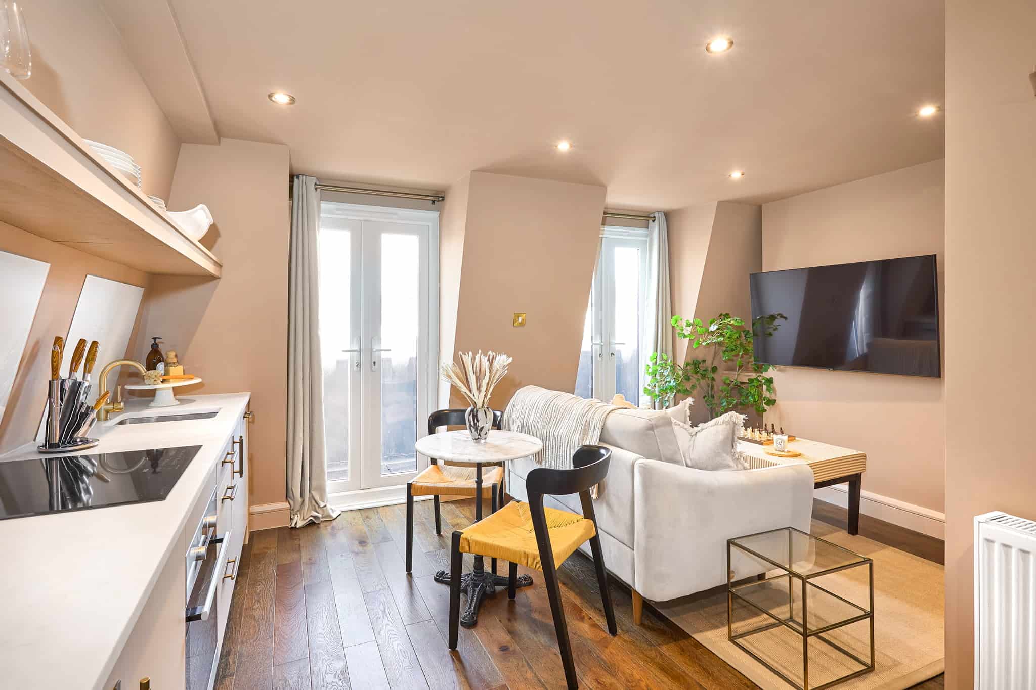 Inside, each apartment features spacious living areas with stylish furnishings, large sofas, and Smart HDTVs. Dining spaces are comfortably arranged for both everyday meals and occasional entertaining. Kitchens come fully fitted with high-spec appliances, allowing you to cook at home with ease. Bathrooms are finished to a luxurious standard, with rainfall walk-in showers and premium fittings. Bedrooms are restful and refined, with king size beds, plush linens, and an additional television for winding down at the end of the day. The lower ground apartment includes a versatile bonus room that works well as a home office or a single guest bedroom—perfect for professionals needing extra space. Meanwhile, the penthouse offers a private terrace where you can enjoy fresh air, morning coffee, or a quiet evening outdoors.