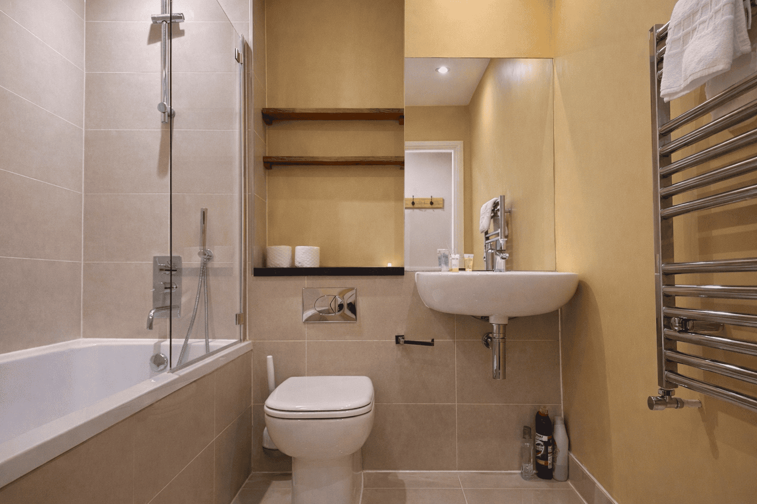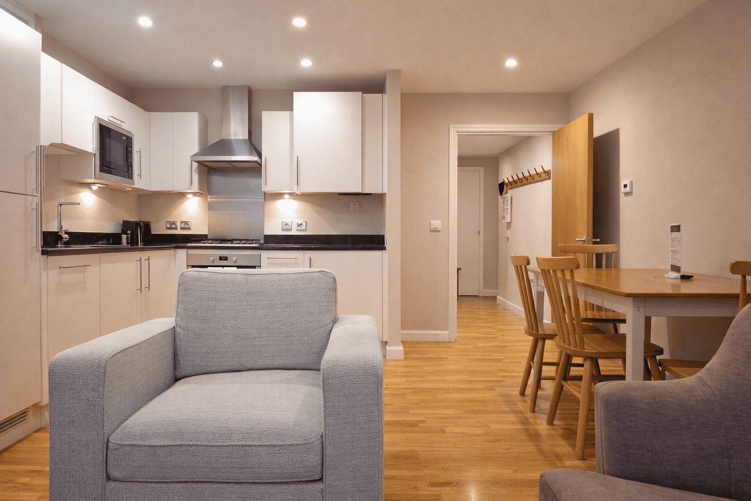 Inside, the apartment is equipped for business and longer stays alike. High-speed Wi-Fi and a generous layout make it easy to work remotely, host calls, or prepare for meetings. The living area is well-furnished for comfort, while the kitchen includes a dishwasher, washer/dryer, and everything needed to cook or dine in. The bedroom is thoughtfully arranged for rest, featuring a comfortable double bed, blackout curtains, and built-in storage. Whether you’re in town for a few days or several weeks, this Serviced Apartment in Clerkenwell delivers the flexibility of a home away from home.