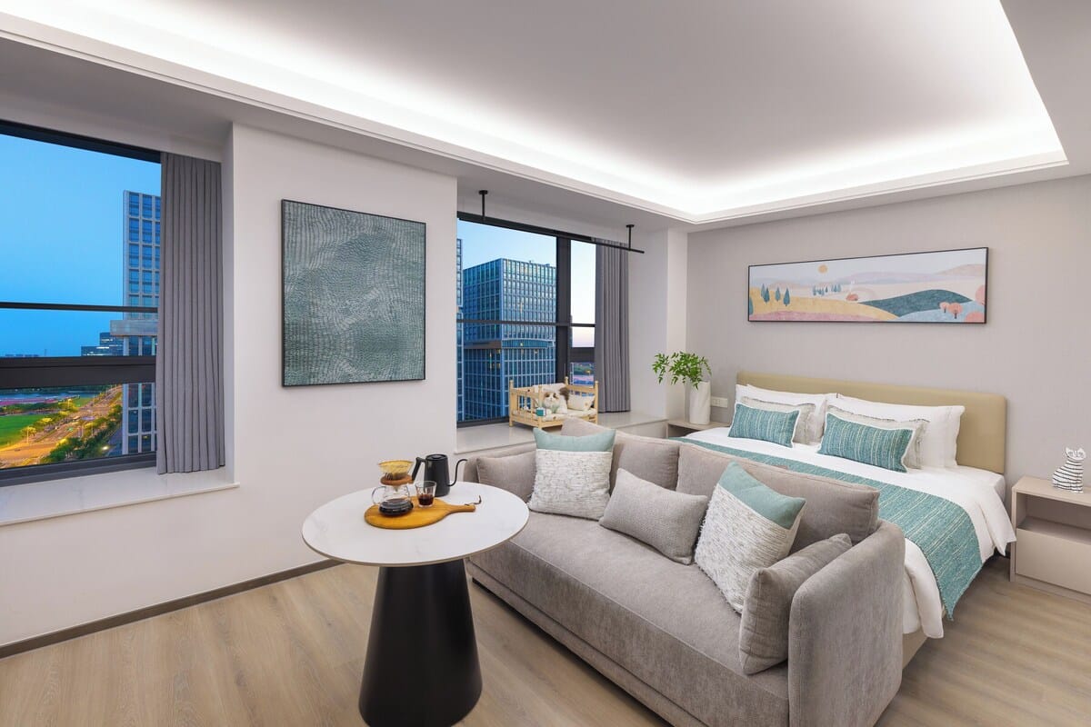 Each of the 194 apartments at Suzhou Baitang Aparthotel is designed to feel like a sophisticated, full‑service home. Configurations range from studios to four‑bedroom units — all featuring separate living and dining areas, fully equipped kitchens, washing machines, and large windows that allow natural light to flood the space. Whether you’re arriving for a short stay or planning to settle in for months, the residences deliver a seamless “home‑away‑from-home” experience with comforts such as air conditioning, free high‑speed Wi‑Fi, flat-screen TVs, and tasteful, modern furnishings.