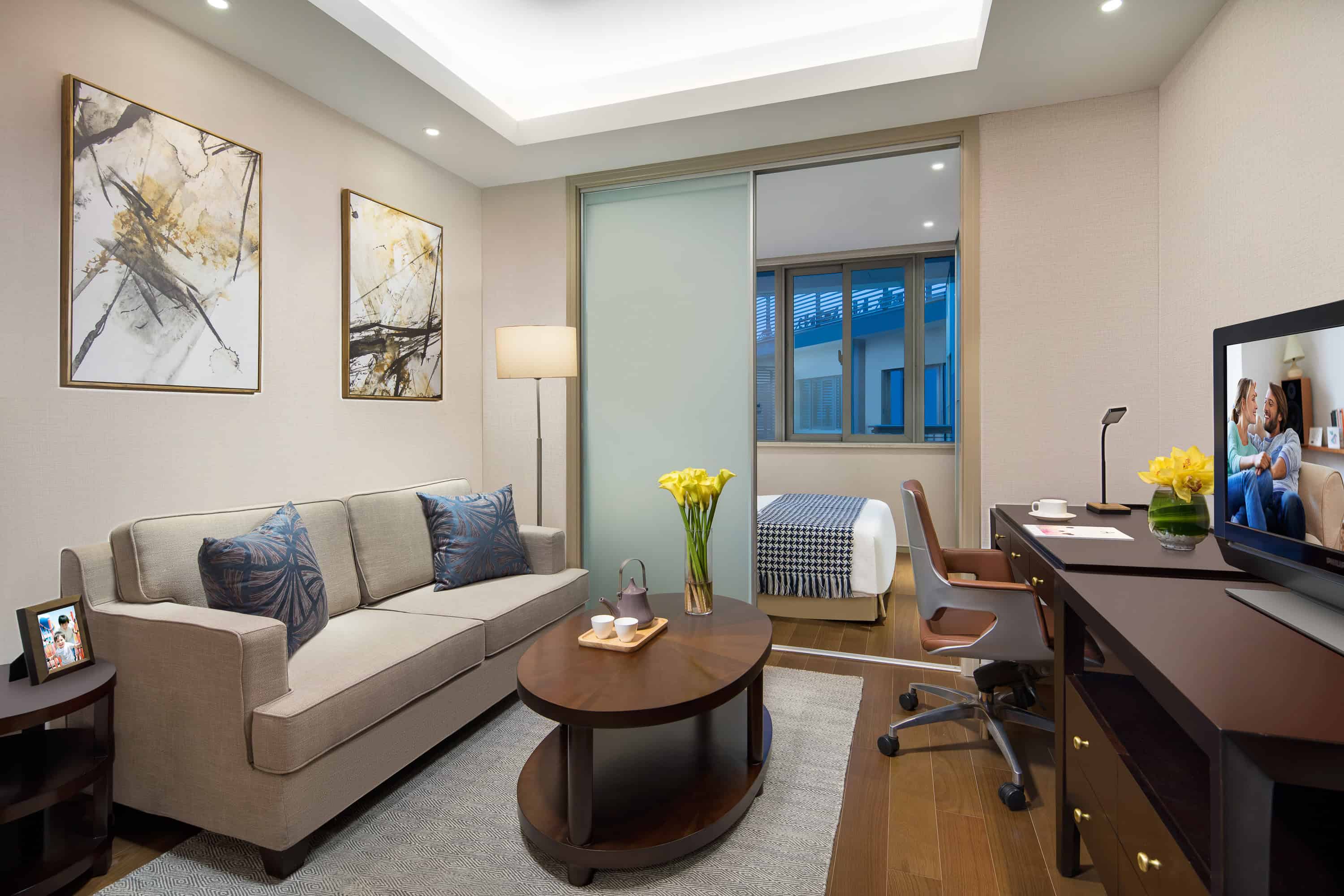 Suzhou Emerald City Aparthotel apartments are styled with modern, functional design and include full-service comforts to deliver a “home away from home” experience. Units range from studios to one- and two-bedroom apartments, all equipped with fully functioning kitchens, in-unit washing and drying facilities, comfortable living and dining areas, and tasteful décor. Large windows and — where available — balconies or terraces ensure units feel bright and spacious, ideal for both short stays and extended residencies. The inclusion of in-room amenities such as cable or satellite TV, Wi-Fi, and climate control ensures that guests have both comfort and convenience at all times.