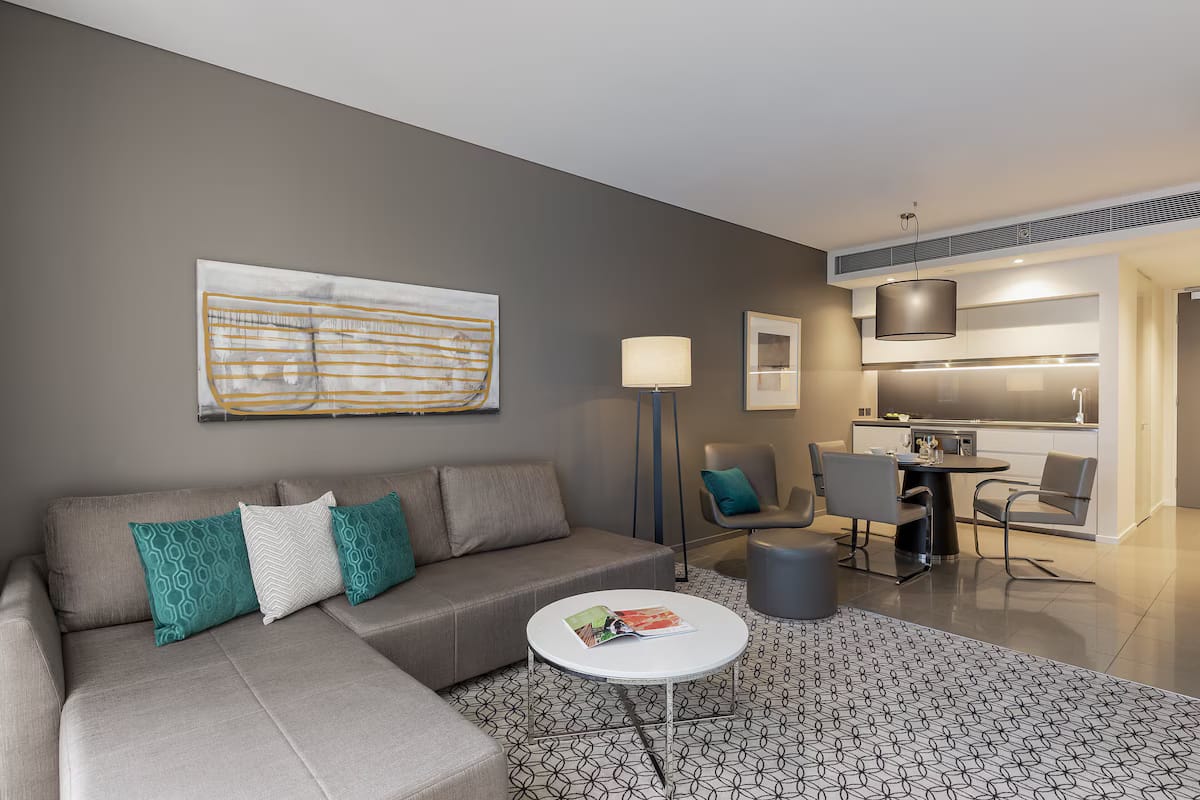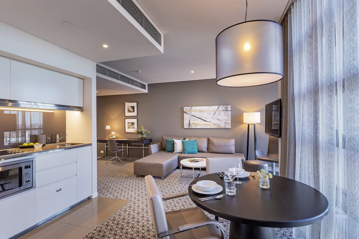 On-site dining is available at Thomas St Kitchen and Bar, offering a hearty menu of favourites such as steak and burgers in a casual yet stylish setting. For business travellers, the aparthotel features 12 multi-purpose meeting rooms and a fully serviced business centre complete with a web corner and printing services. Grab a barista-made coffee in the lobby lounge before heading out for the day or take advantage of the coworking-friendly environment for a productive remote work session. Whether you’re travelling for business, leisure, or a mix of both, this Sydney CBD hotel provides the ideal balance of location, amenities, and comfort for a truly connected stay in one of Australia’s most iconic cities.