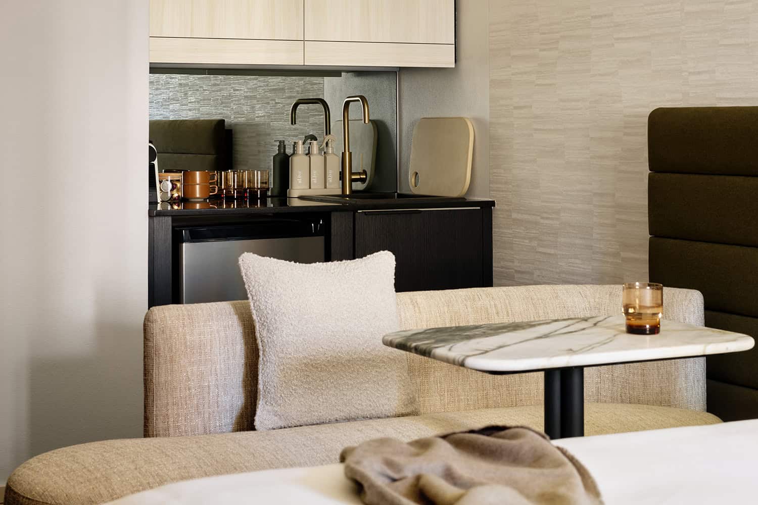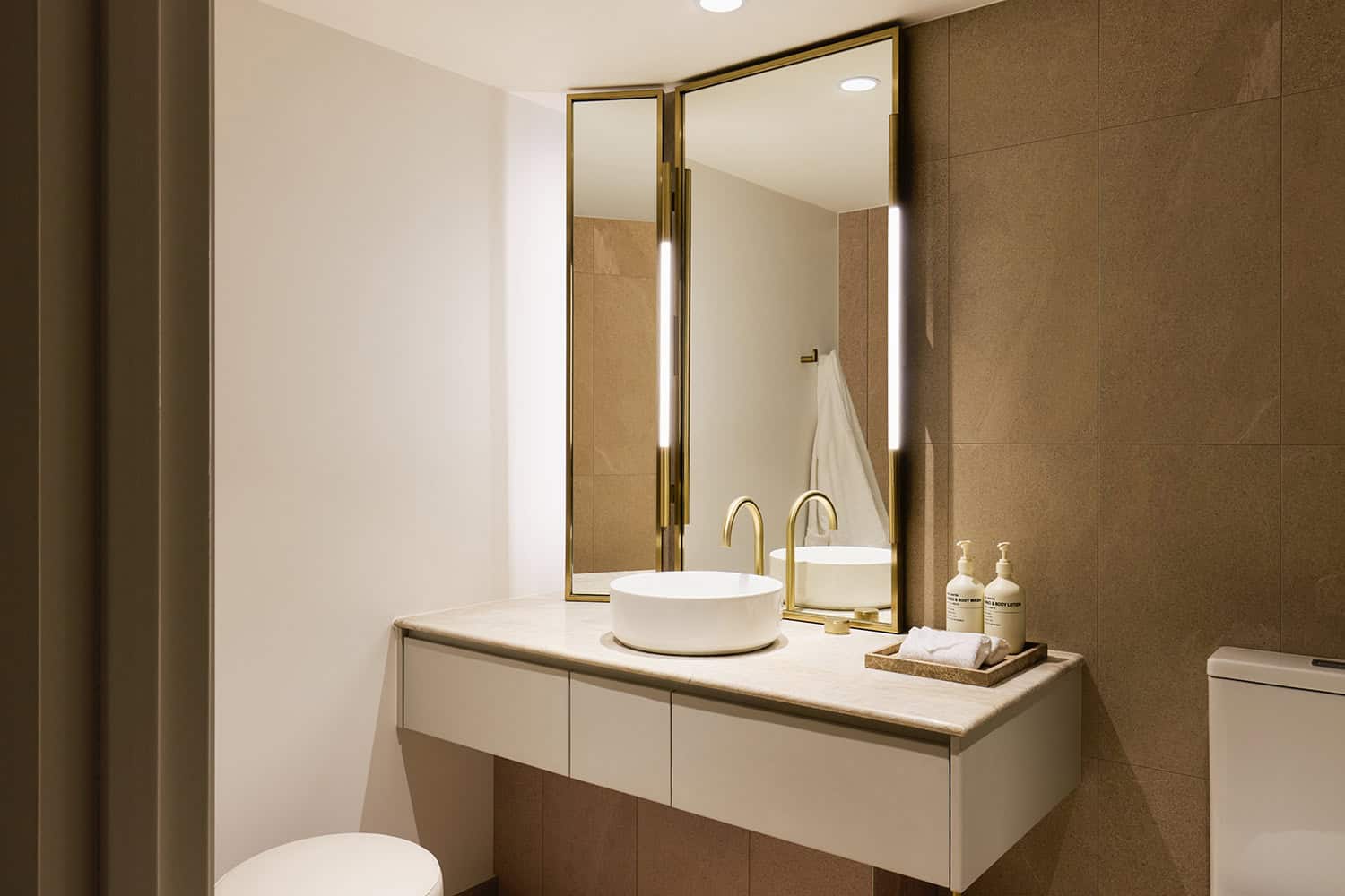 The aparthotel offers a wide selection of modern accommodations, including studio, one-, two-, and three-bedroom apartments, each designed to feel like a true home away from home. All apartments feature fully equipped kitchens with oven, stovetop, microwave, dishwasher, refrigerator, and kitchenware, perfect for self-catering convenience. Spacious living and dining areas include flat-screen TVs with Chromecast, complimentary high-speed Wi-Fi, work desks, and individually controlled air-conditioning. Many apartments also offer private balconies with sweeping views of the Sydney skyline. Bathrooms are fitted with high-quality toiletries, hairdryers, and large showers or bathtubs, while in-room laundry facilities (washing machine and dryer) add convenience for longer stays. The interiors feature soft neutral tones, contemporary décor, and ample natural light, ensuring a relaxing and comfortable atmosphere throughout.
