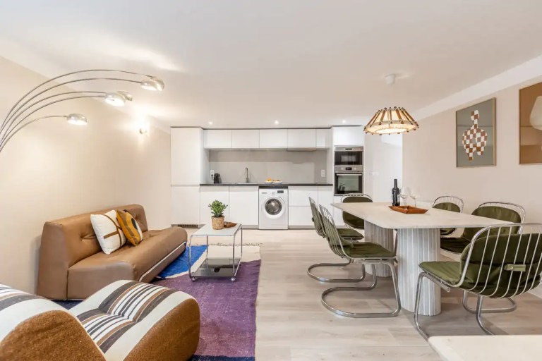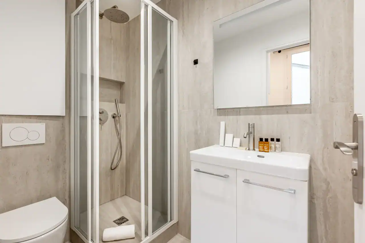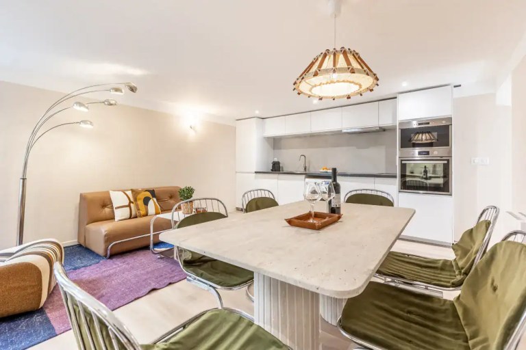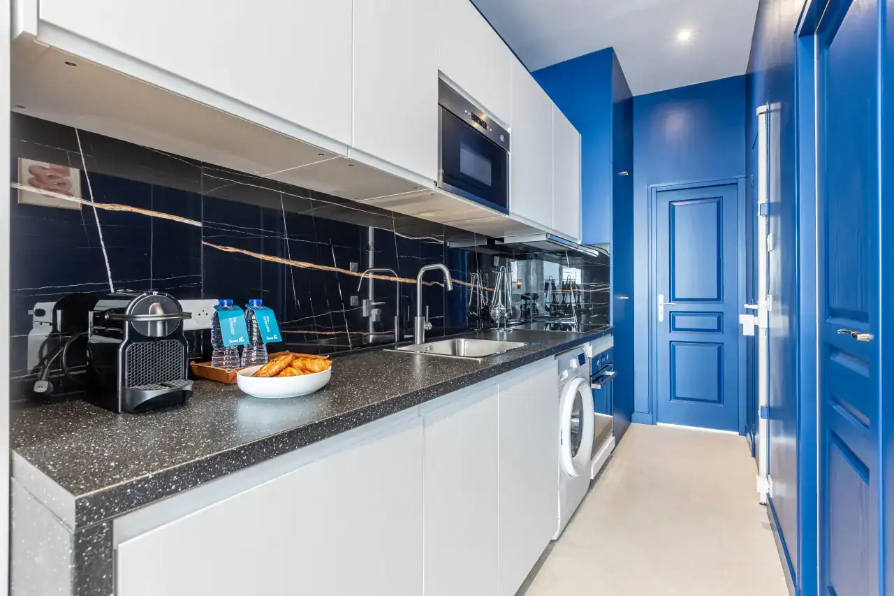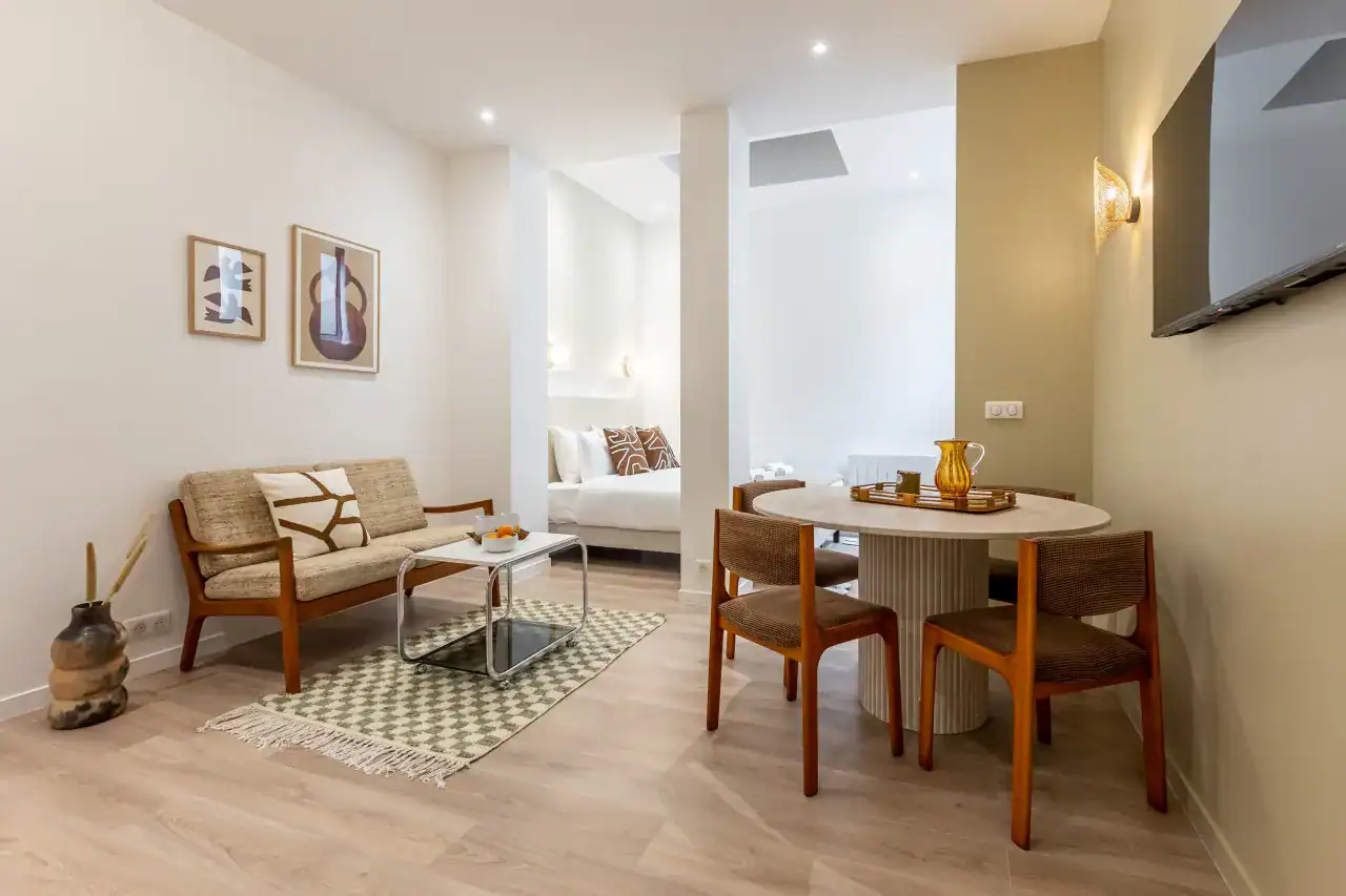 The studios are perfect for couples or solo travelers, featuring refined furnishings, elegant color palettes, and charming décor that create a cozy yet sophisticated retreat. The two-bedroom apartment provides more space and flexibility, complete with a fully equipped kitchen, a dining area for shared meals, and high-quality mattresses that ensure a restful night’s sleep. Each unit is equipped with premium amenities, including free WiFi, cable TV, hotel-quality beds and linens, high-end toiletries, and sleek furniture. Guests will also appreciate extra conveniences such as a Nespresso machine, luxury bedding, and modern kitchen appliances, making each apartment both stylish and functional. After a day exploring the city, these welcoming interiors provide the perfect place to unwind and relax.