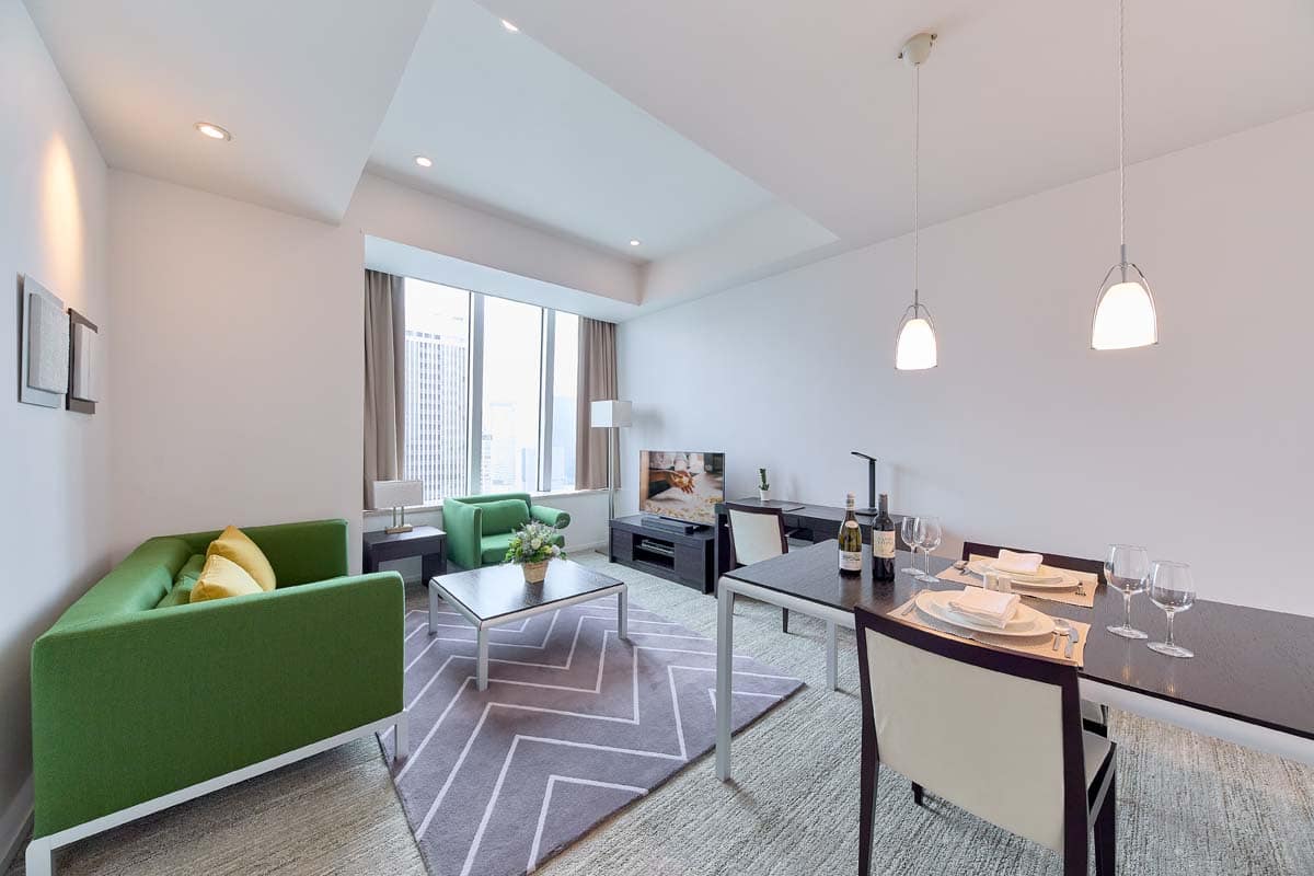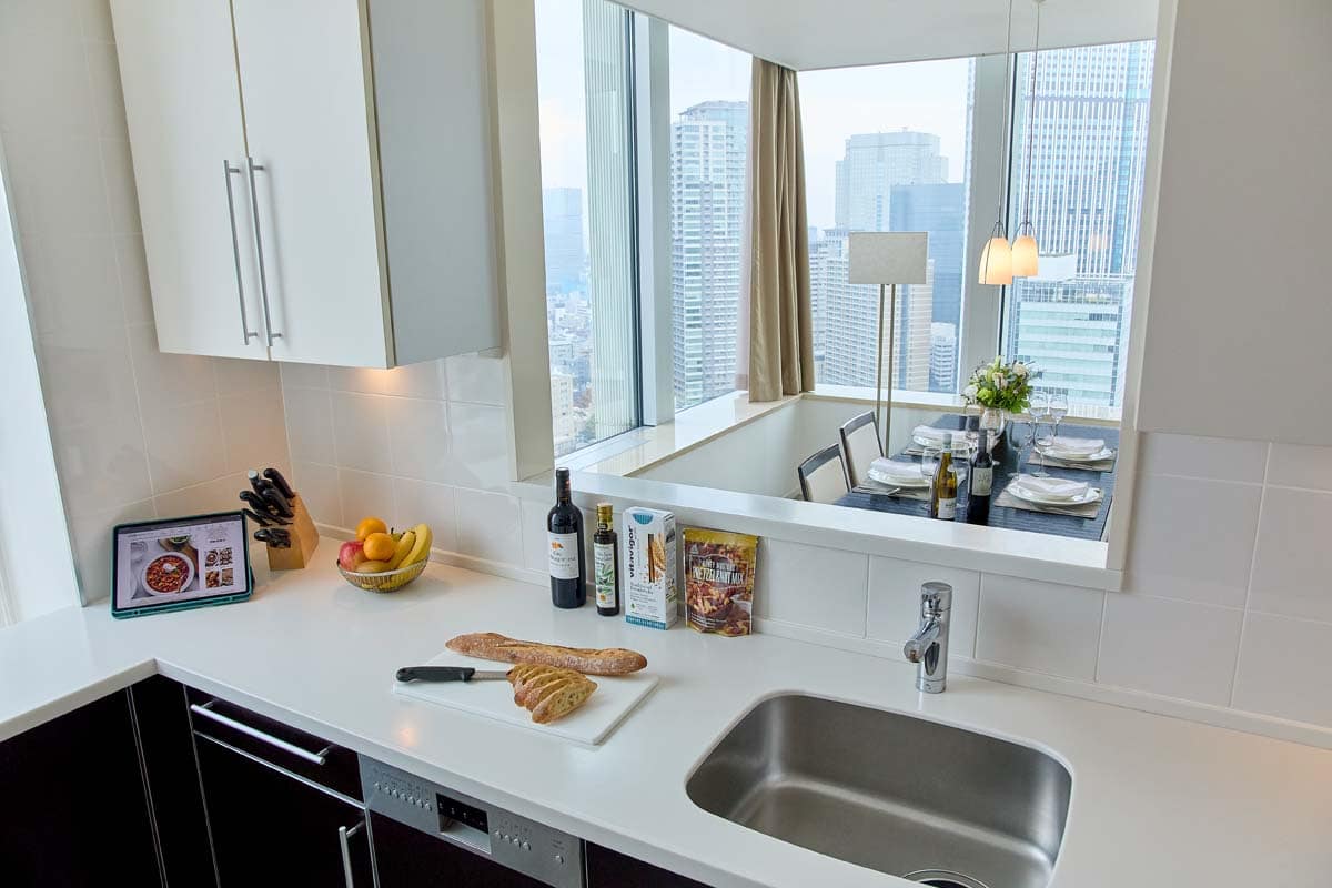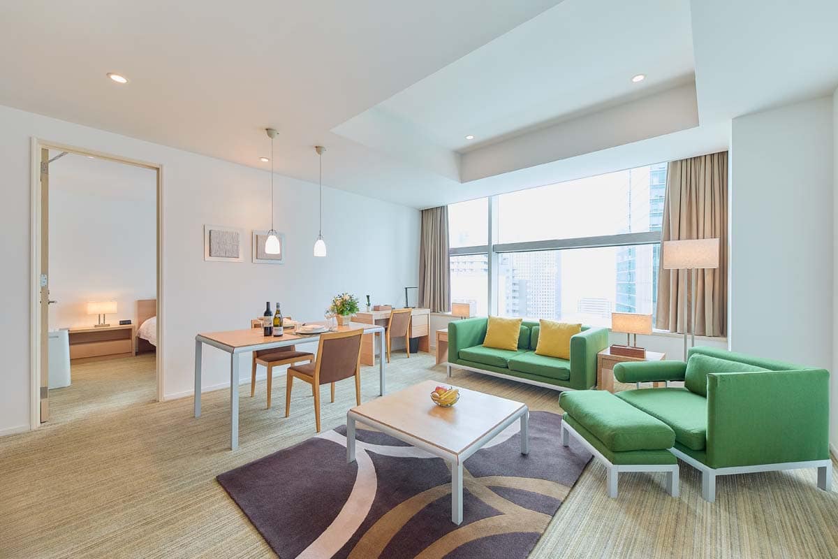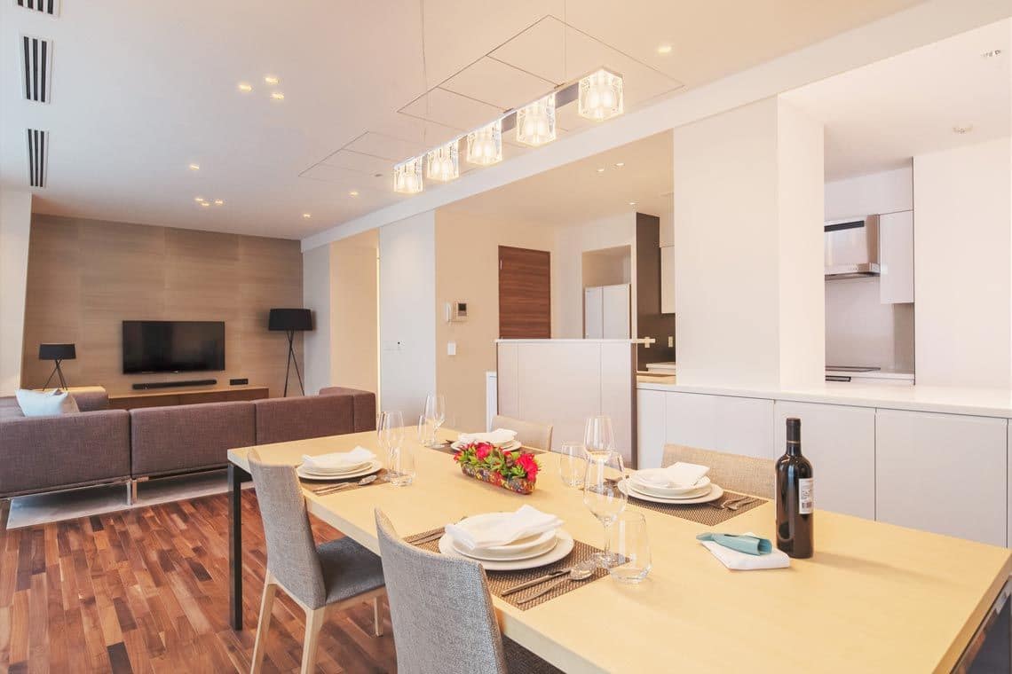 The aparthotel features a range of fully furnished serviced apartments, including studios as well as one-, two-, and three-bedroom layouts, designed to accommodate short visits and extended stays alike. Interiors combine modern comfort with subtle Japanese influences, creating a warm and welcoming residential feel. Apartments are equipped with practical amenities such as fully fitted kitchens, in-room washer and dryer units, air conditioning, and high-speed Wi-Fi, allowing guests to enjoy independence and flexibility during their stay. Spacious living areas provide comfortable settings for dining, working remotely, or simply unwinding after a day exploring the city.