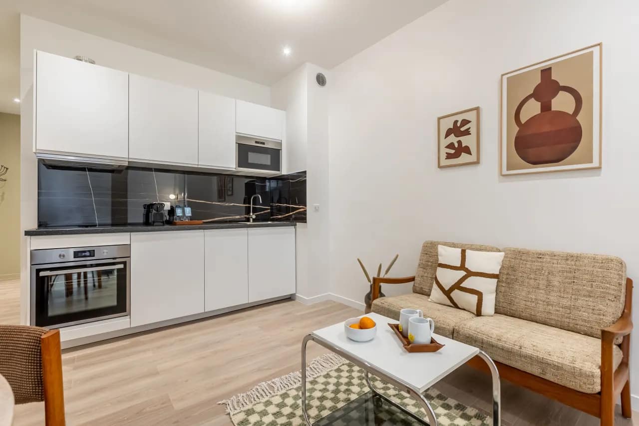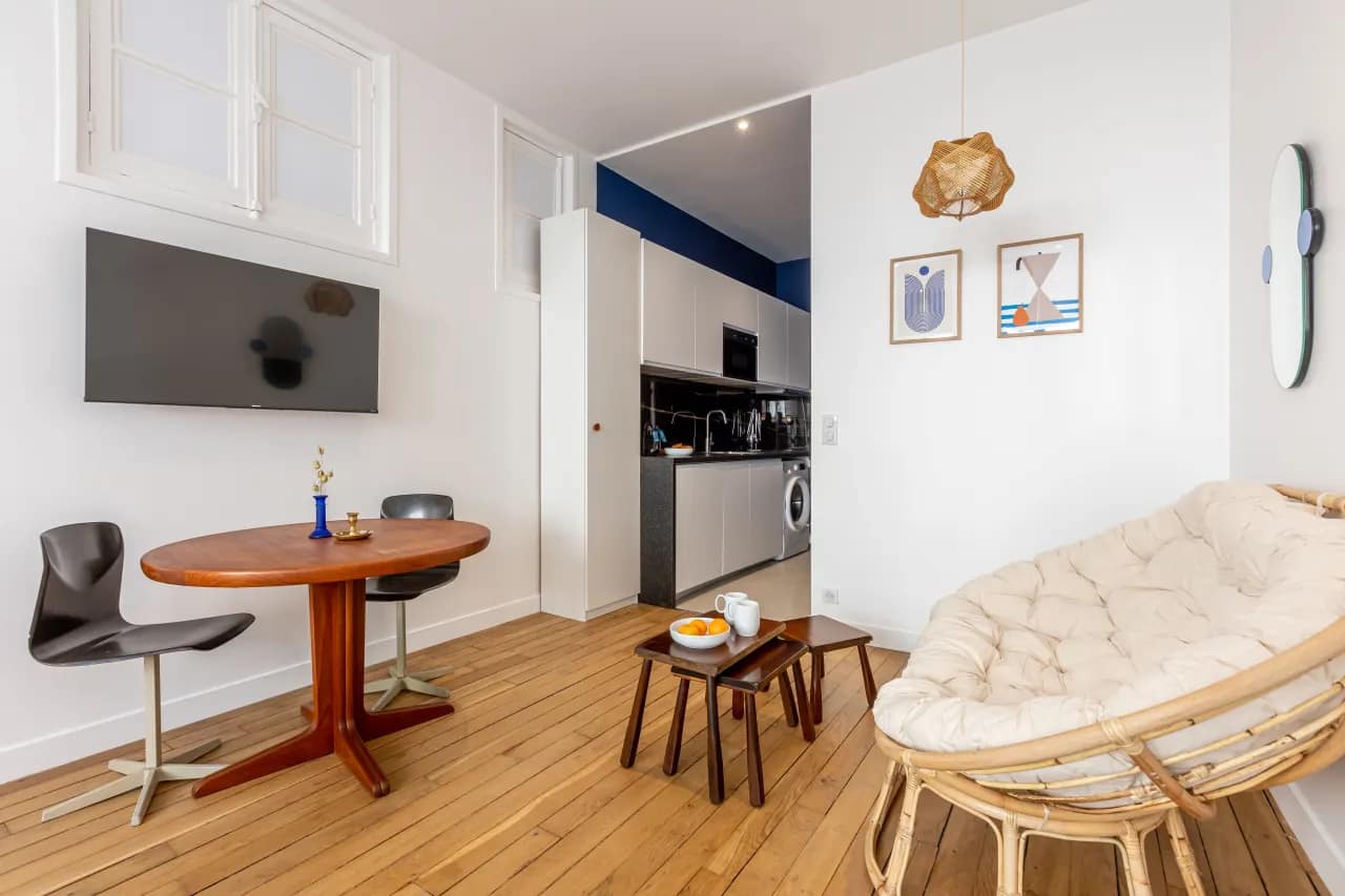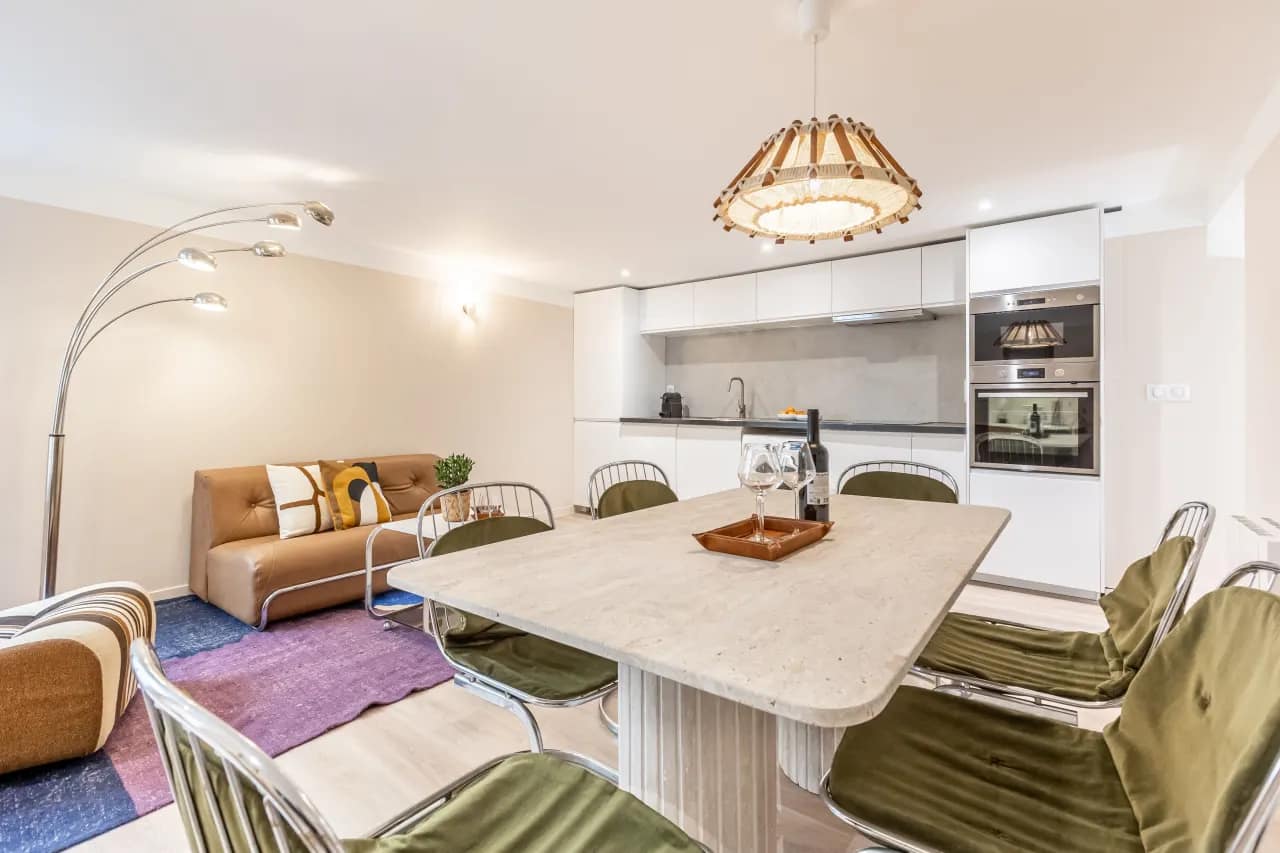 In the heart of Paris’s prestigious Madeleine-Vendôme neighbourhood, the three bedroom Tuileries Garden Apartments offer a refined blend of Parisian charm and modern comfort. Designed by a local interior designer, the space welcomes you with warm wooden flooring, high ceilings, and an inviting layout that balances elegance with cosiness. Exposed rafters highlight the apartment’s rustic character, while carefully curated wall art introduces a playful and unexpected twist. The fully equipped kitchen is ideal for preparing gourmet meals, whether you’re enjoying a casual breakfast with family or a dinner shared with friends.
