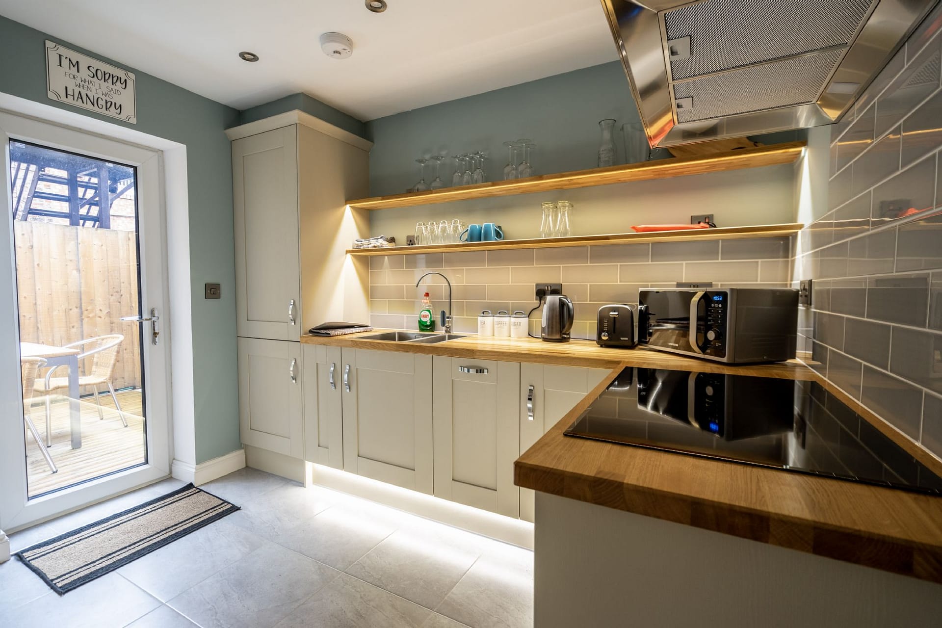 The ground floor features an open-plan lounge and dining area with attractive wood flooring and a Smart TV for entertainment. The dining table comfortably seats four, ideal for shared meals or evening gatherings. A modern kitchen at the rear of the property is fitted with high-end appliances and all the essentials required for a self-catering stay, making it simple to prepare breakfast, lunch, or dinner. From the kitchen, doors lead out to a private decked patio, a perfect spot to enjoy a summer evening with a coffee in the morning or a drink at sunset, providing an extra space for relaxation.