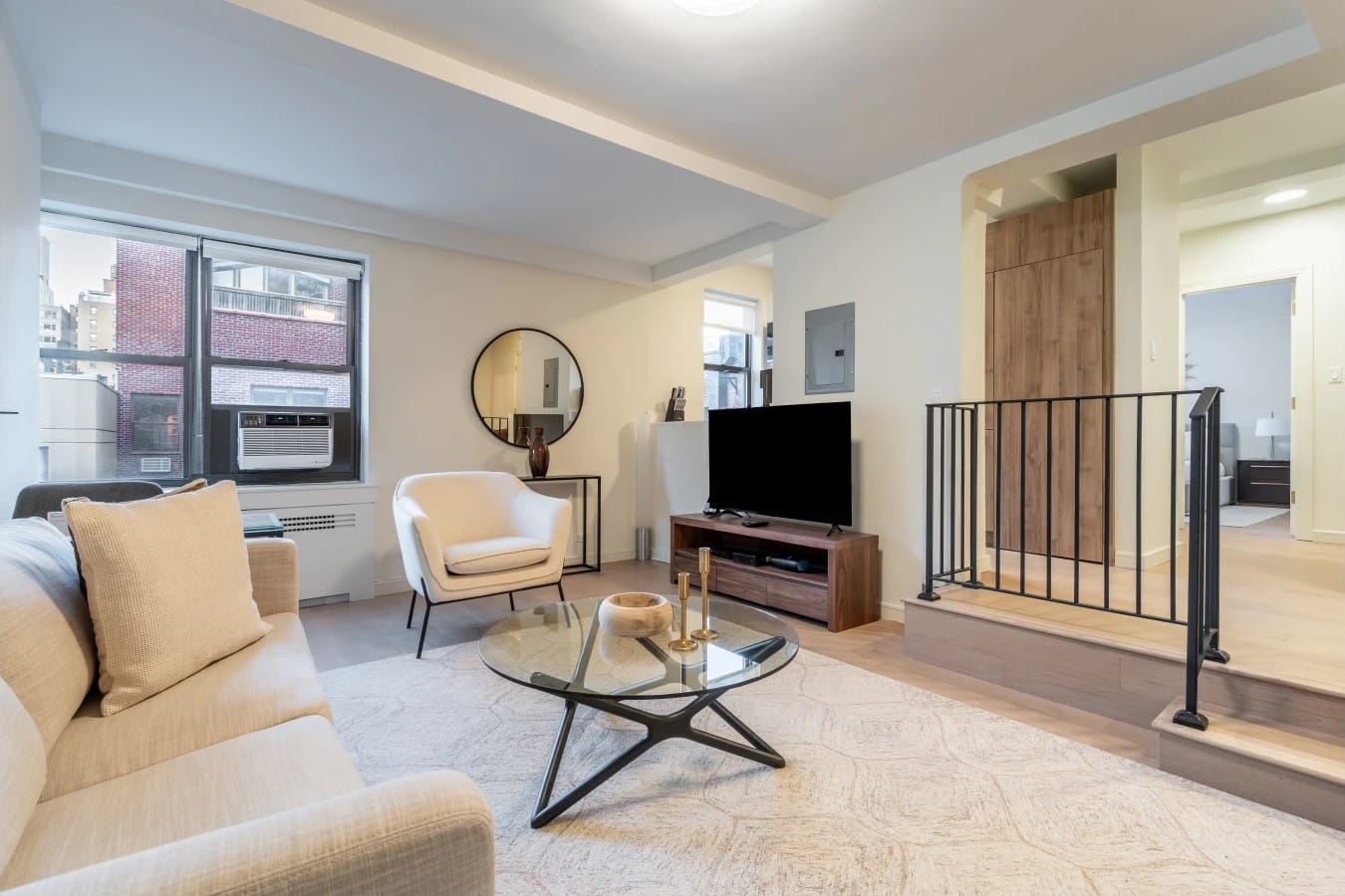 Upper East Side The Prescott – a spacious one bedroom apartment offering a sophisticated blend of modern comfort and timeless charm. Situated in one of Manhattan’s most desirable neighborhoods with unparalleled access throughout New York City. Thoughtfully designed interiors feature high coffered ceilings, oversized windows, and rich hardwood flooring that create a sense of warmth and openness. The chef’s kitchen is fully equipped with integrated stainless-steel appliances and custom cabinetry, ideal for both everyday living and entertaining. The bedroom includes a walk-in closet and is furnished with plush linens and pillows, while the bathroom showcases custom stone finishes that elevate your stay with elegance and ease. Additional highlights include an in-unit washer/dryer and an abundance of closet space.