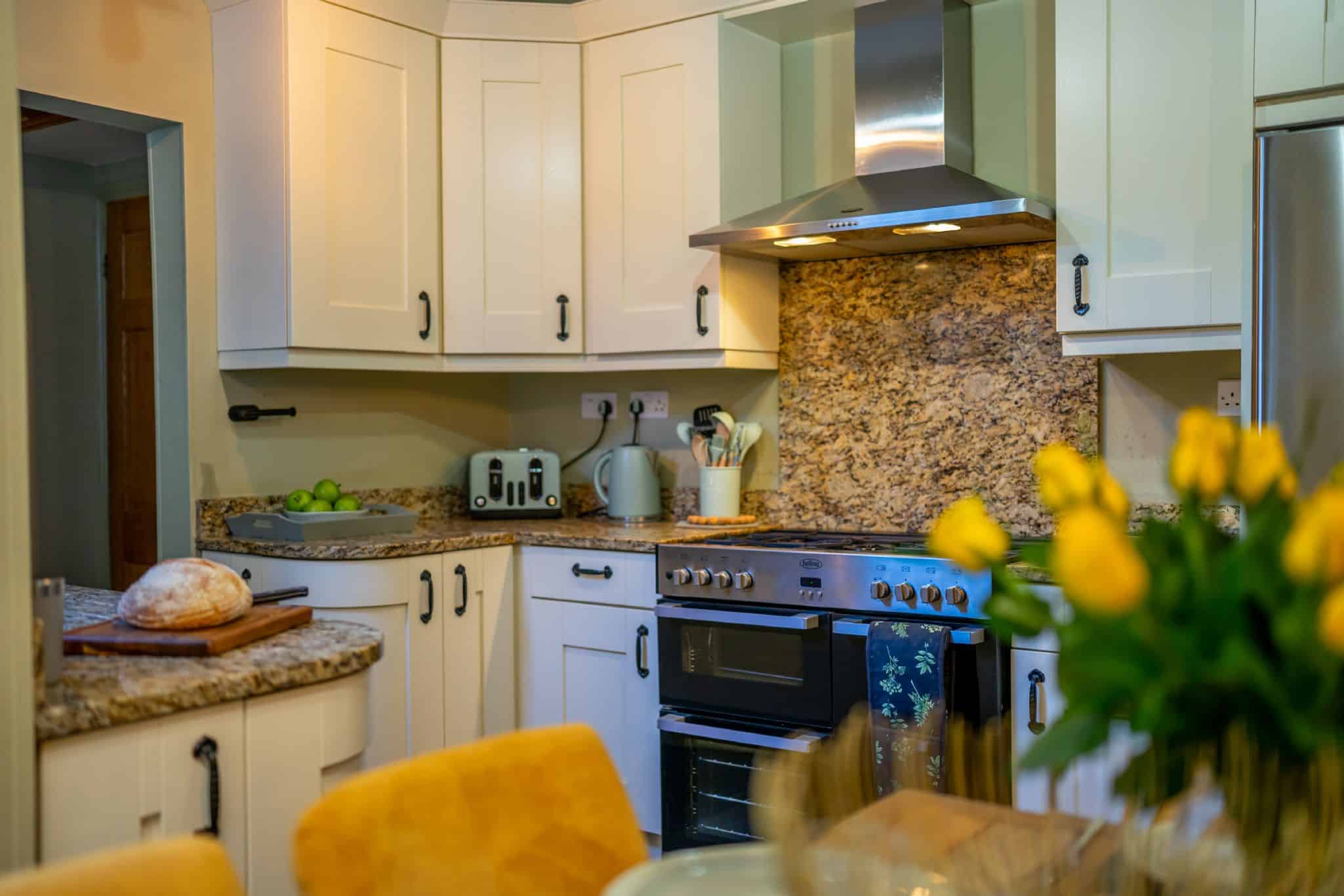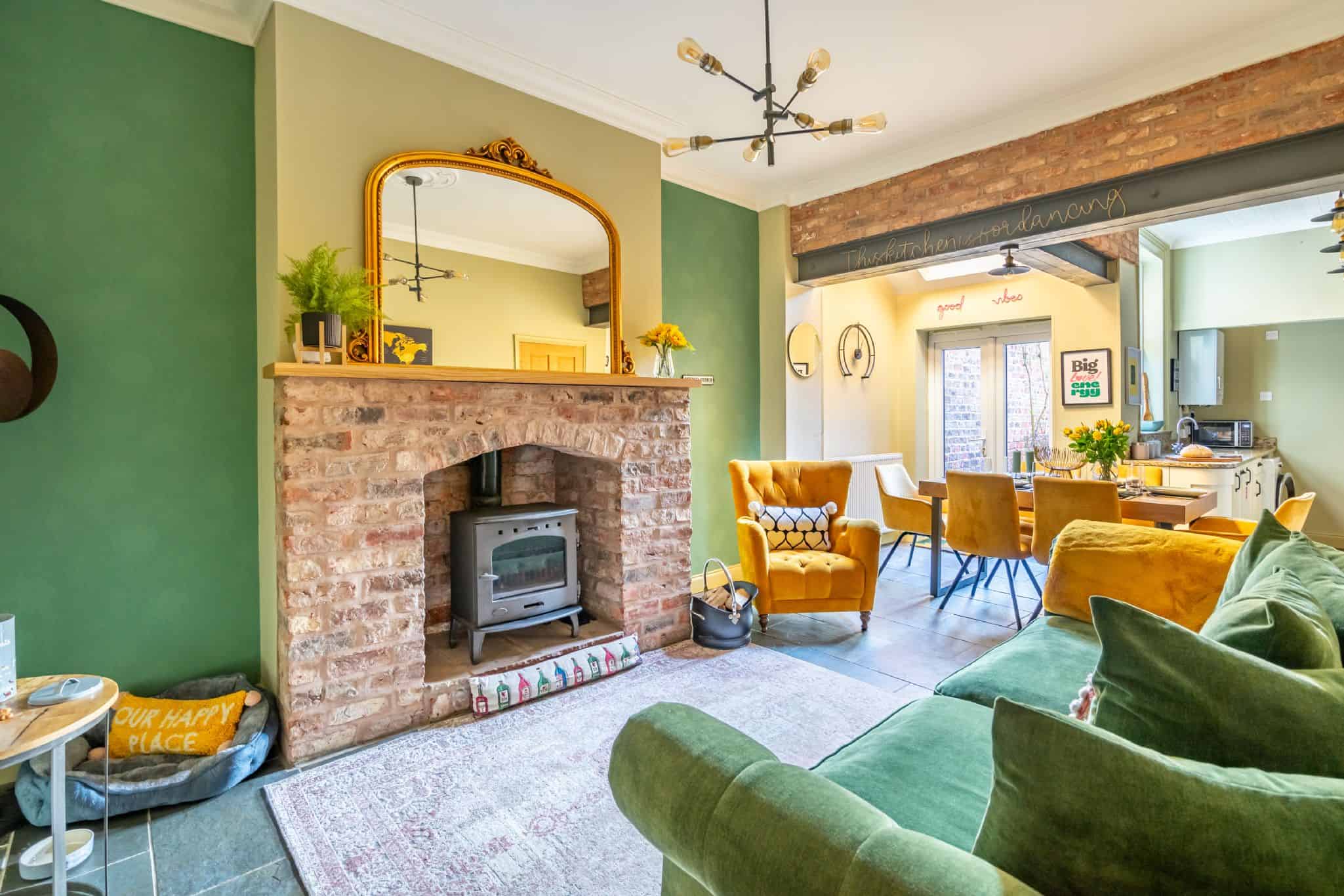 The heart of the property is the bright and inviting living area, where guests can unwind after a day of sightseeing. Furnished with plush seating and a Smart TV with Freeview, it’s a warm and sociable space, perfect for relaxing with a film or gathering around the log burner on cooler evenings. The fully equipped kitchen comes complete with a gas hob, oven, fridge-freezer, dishwasher, microwave, and all the essentials for preparing meals, while the dining area offers a comfortable spot for shared breakfasts and dinners. Patio doors open to a private garden with seating, making it easy to enjoy your morning coffee outdoors or unwind with a glass of wine in the evening. This combination of indoor and outdoor living makes the house ideal for both short breaks and longer stays.