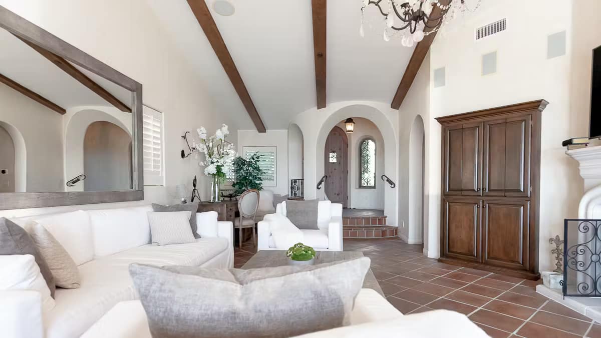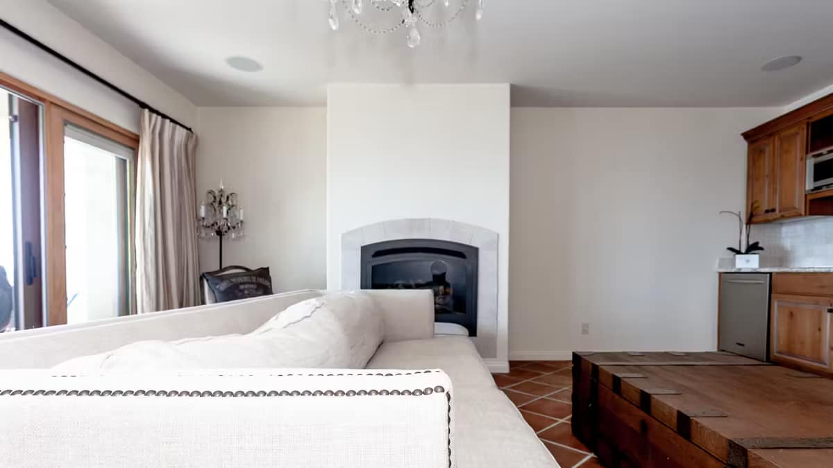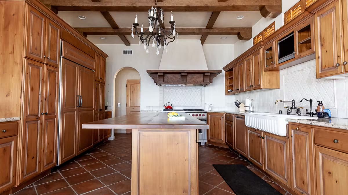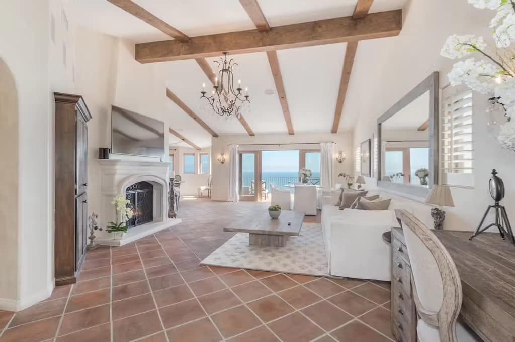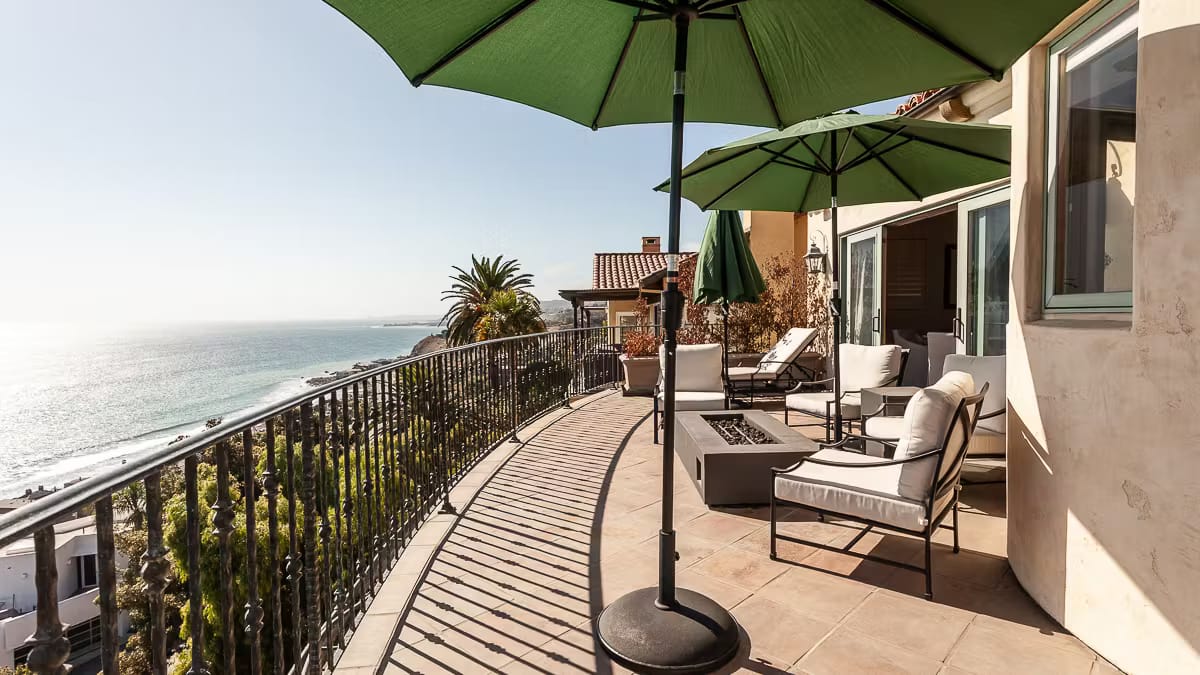 This Malibu ocean view home features four bedrooms, three baths, and three private balconies with panoramic Pacific vistas. Elegant interiors blend classic charm with modern comfort, while lush gardens,